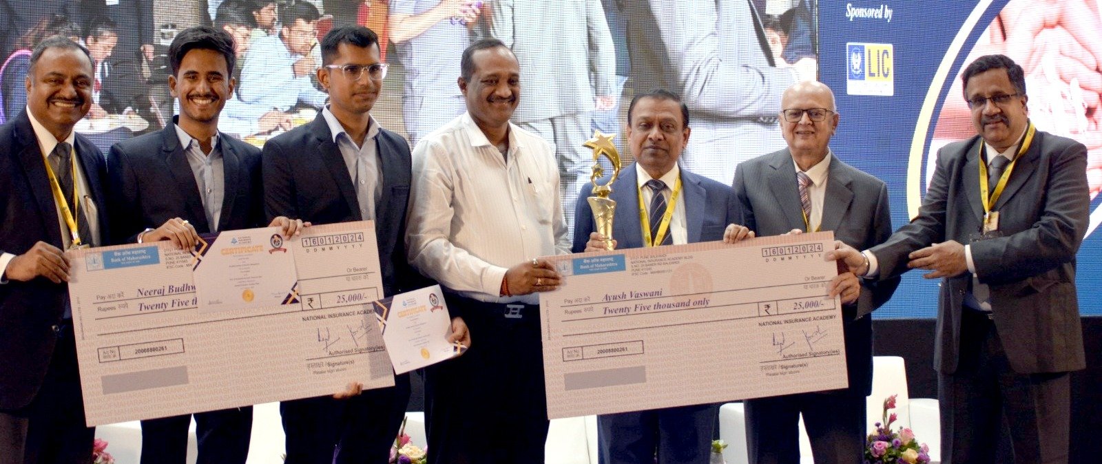 भारतीय आयुर्विमा महामंडळाचे अध्यक्ष सिद्धार्थ मोहंती यांच्या हस्ते प्रतिभा इन्स्टिट्युट ऑफ बिझनेस मॅनेजमेंट मधील एम.बी.ए.चे विभाग प्रमुख प्रा.गुरुराज डांगरे, प्रा. तुलिका चटर्जी समवेत प्रथम क्रमांक पटकाविणारे विजेते एम.बी.ए.चे विद्यार्थी आयुष वासवानी व नीरज बुधवानी यांना भव्य चषक व प्रत्येकी 25 हजारांचा धनादेश प्रदान केला. स्पर्धेत त्यांनी विम्यावरील त्याची प्रतिभा आणि ज्ञान दाखवून स्पर्धा जिंकत उपस्थितांनी मने जिंकली.