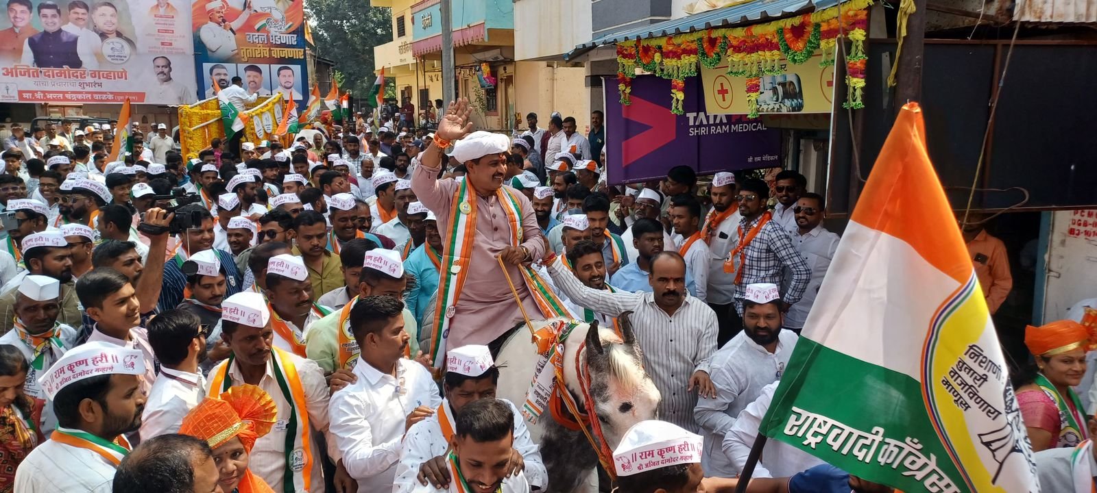 महाविकास आघाडीचे उमेदवार अजित गव्हाणे यांनी दिघी परिसरातील प्रचार दौऱ्यामध्ये आज चक्क घोड्यावर स्वार होऊन नागरिकांशी संवाद साधला. अजित गव्हाणे यांची घोड्यावर बसून झालेली ही ”एन्ट्री” अतिशय लक्षवेधी ठरली. आजच्या प्रचार दौऱ्यामध्ये दिघीकरांनी बैलगाडी देखील आणली होती. फुलांनी सजवलेली बैलगाडी आणि त्यावर मध्यभागी ठेवण्यात आलेले तुतारी वाजवणारा माणूस हे चिन्ह लक्ष वेधून घेत होते.