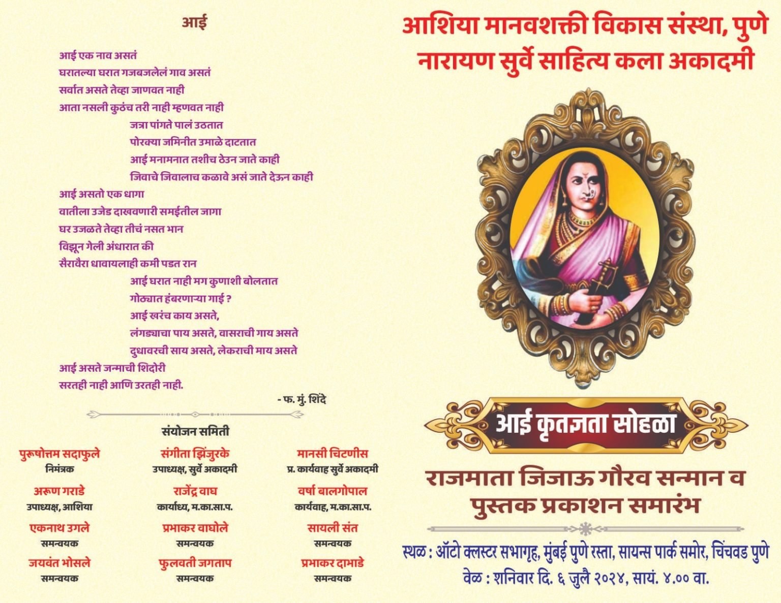 पिंपरी (महाराष्ट्र ब्रेकिंग न्यूज) – आशिया मानवशक्ती विकास संस्था – पुणे आणि नारायण सुर्वे साहित्य कला अकादमी यांच्या संयुक्त विद्यमाने शनिवार, दिनांक ०६ जुलै २०२४ रोजी दुपारी ठीक ४:०० वाजता ऑटोक्लस्टर सभागृह, जुना मुंबई – पुणे हमरस्ता, सायन्स पार्कसमोर, चिंचवड येथे आई कृतज्ञता सोहळा व पुस्तक प्रकाशन या कार्यक्रमाचे आयोजन करण्यात आले आहे.