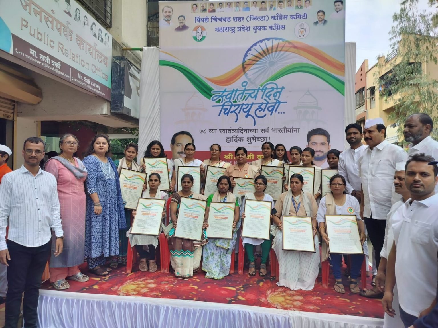 युवक काँग्रेसच्या वतीने स्वातंत्र दिनाचे औचित्य साधून शोभा दत्तात्रेय मस्के, सुवर्णा अरुण पवार, संगीता संदीप मोरे, क्रांती दिनकर होनमुने, मृणाली कमलेश वाघमारे, नुसरत मोसिन शेख, शैला निलेश दाभेकर, जयश्री मारुती चासकर, प्रियंका विलास चासकर नीलम हिरालाल जाधव, सरिता सहदेव गोळे, प्रज्ञा मंगेश ओवाळ, ज्योती विनोद पाचारणे, योगिता पप्पू पालवे, अंजली विनोद जावळे, नीता आनंद कारंडे, शोभा नरसिंग पांचाळ, मनीषा भरत दौंड, राणी गोविंद थोरात या आशा स्वयंसेविकांचा सन्मानपत्र आणि शाल देऊन सन्मान करण्यात आला.