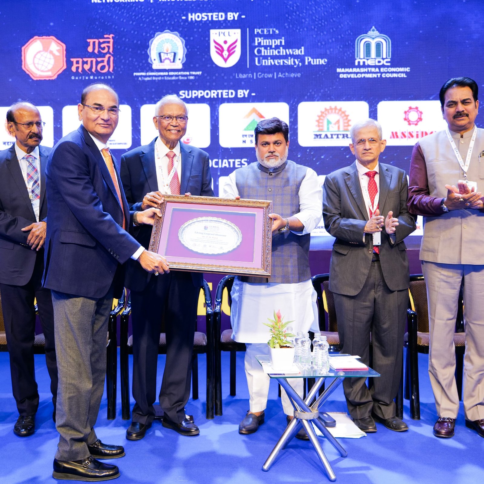 पुणे, (महाराष्ट्र ब्रेकिंग न्यूज ) – येथे नुकत्याच झालेल्या ‘ग्लोबल आंत्रप्रेन्युअर्स कॉन्क्लेव्ह २०२५’ मध्ये डॉ. डी. वाय. पाटील विद्यापीठाचे कुलपती डॉ. पी. डी. पाटील यांना लिव्हींग लिजंड ऑनर ने सन्मानाने गौरवण्यात आले. उद्योगमंत्री उदय सामंत यांच्या हस्ते डॉ. पाटील यांना विशेष स्मृतिचिन्ह प्रदान करण्यात आले. ज्येष्ठ शास्त्रज्ञ डॉ. रघुनाथ माशेलकर, ज्येष्ठ विचारवंत संदीप वासलेकर, ज्येष्ठ उद्योजक प्रतापराव पवार, माजी मंत्री हर्षवर्धन पाटील, महाराष्ट्र आर्थिक विकास मंडळाचे उपाध्यक्ष व परिषदेचे मुख्य संयोजक सचिन ईटकर यांची उपस्थिती या कार्यक्रमाला होती. परिषदेचे उद्घाटन केंद्रीय रस्ते व महामार्ग मंत्री नितीन गडकरी यांच्या हस्ते ऑनलाईन पद्धतीने झाले. महाराष्ट्राचे उद्योगमंत्री ना. उदय सामंत यांची प्रमुख उपस्थिती कार्यक्रमाला होती.