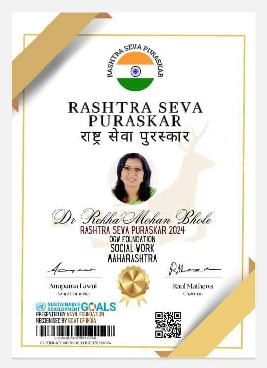 पिंपरी, (महाराष्ट्र ब्रेकिंग न्यूज) – महाराष्ट्र राज्यातील पुणे येथील डॉ. रेखा मोहन भोळे यांना  veyil फाउंडेशन तर्फे राष्ट्र सेवा पुरस्कार 2024 ने सन्मानित करण्यात आले आहे .
