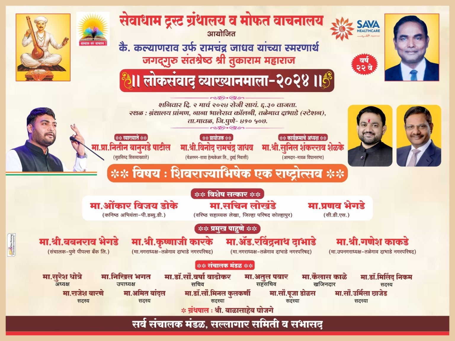 पिंपरी,(महाराष्ट्र ब्रेकिंग न्यूज) – तळेगाव दाभाडे येथील सेवाधाम ट्रस्ट ग्रंथालय व मोफत वाचनालय यांच्या वतीने दरवर्षीप्रमाणे यंदाही येत्या 2 मार्च रोजी कै. कल्याणराव उर्फ रामचंद्र जाधव यांच्या स्मरणार्थ जगद्गुरू संतश्रेष्ठ तुकाराम महाराज लोकसंवाद व्याख्यानमालेंतर्गत शिवचरित्राचे अभ्यासक प्रा. नितीन बानगुडे पाटील यांच्या व्याख्यानाचे आयोजन करण्यात आले आहे, अशी माहिती संस्थेचे अध्यक्ष नगर परिषदेचे माजी नगराध्यक्ष सुरेश धोत्रे यांनी दिली.