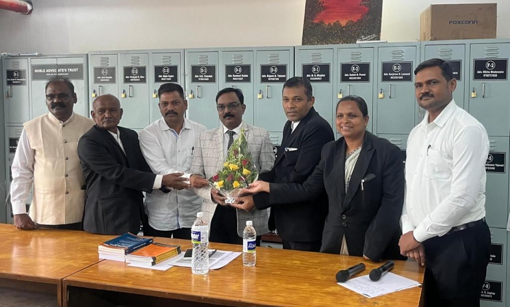 यावेळी असोसिएशनच्या अध्यक्षा ॲड.प्रमिला हरीश गाडे, उपाध्यक्ष ॲड.गोरख भागवत कुंभार, मा. ॲड.नारायण रसाळ, ॲड.सुनिल कडूसकर, ॲड.किरण पवार ॲड.सुदाम साने, ॲड.अरुण खरात यांच्या हस्ते या कार्यक्रमास मार्गदर्शक म्हणून लाभलेले जिल्हा न्यायालयाचे मा.न्यायाधीश श्री.राजन गुंजीकर यांचा पुष्पगुच्च देवून सत्कार करण्यात आला.