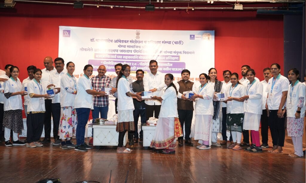 डॉ. बाबासाहेब आंबेडकर संशोधन व प्रशिक्षण संस्था (बार्टी), मोरया सामाजिक प्रतिष्ठान, लोकनेते आमदार लक्ष्मण जगताप पॅरामेडीकल कॉलेज यांच्या संयुक्त विद्यमाने बजाज फिन्सर्वच्या सहकार्याने मोफत पॅरामेडिकल प्रशिक्षण, पॅरामेडिकल करिअर 2.0 आणि पॅरामेडिकल क्षेत्रातील कौशल्य प्रशिक्षण युवा पिढीसाठी ‘आत्मनिर्भरतेचे एक नवीन पाऊल’ या विषयावर आधारित कौशल्य विकास व पॅरामेडिकल प्रशिक्षण शैक्षणिक सत्राचा उद्घाटन समारंभ आज (दि. 7 ऑक्टोबर) पिंपळे गुरव येथील नटसम्राट निळू फुले नाट्यगृह या ठिकाणी मोठ्या उत्साहात आणि युवकांच्या उत्स्फूर्त प्रतिसादात संपन्न झाला.
