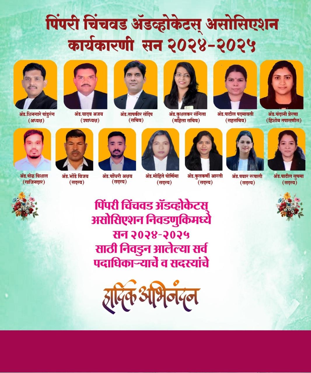 कमिटीच्या अध्यक्षपदी ॲड.पांडूरंग विठ्ठल शिनगारे यांची बिनविरोध निवड झाली तसेच उपाध्यक्ष म्हणून ॲड. अजय रामसुमेर यादव, सचिव म्हणून ॲड. संदिप भाऊसाहेब तापकीर, महिला सचिव ॲड. संगीता रमेश कुशलकर, सहसचिव ॲड. पदमावती लक्ष्मण पाटील , खजिनदार पदी ॲड. विशाल आसाराम पोळ , हिशोब तपासनीस पदी ॲड. प्रेरणा हरेश चंदानी, तसेच सदस्य पदी ॲड. विजय धोंडिराम भोंडे, ॲड. अक्षय कमलाकर चौधरी, ॲड. आरती दत्तात्रय कुलकर्णी, ॲड. पौर्णिमा भगवान मोहिते, ॲड. रूपाली रामचंद्र पवार , ॲड. सुषमा सुदर्शन पाटील यांची बिनविरोध निवड झाली.