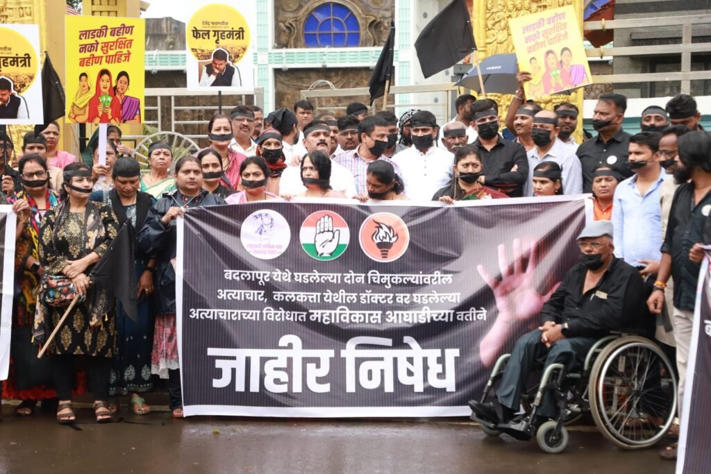 पिंपरी, (महाराष्ट्र ब्रेकिंग न्यूज ) – बदलापूर, छत्रपती संभाजीनगर, अकोला, पुणे, नाशिक, कोल्हापूर येथे घडलेल्या घटनेच्या निषेधार्थ महाविकास आघाडीच्या सर्व पदाधिकारी व कार्यकर्ते यांनी आज पिंपरी येथील डॉ. बाबासाहेब आंबेडकर चौक येथे तोंडाला काळ्या पट्ट्या बांधून आणि हातात काळे झेंडे घेऊन महिला विरोधी महायुती सरकारचा निषेध व्यक्त करण्यात आला.