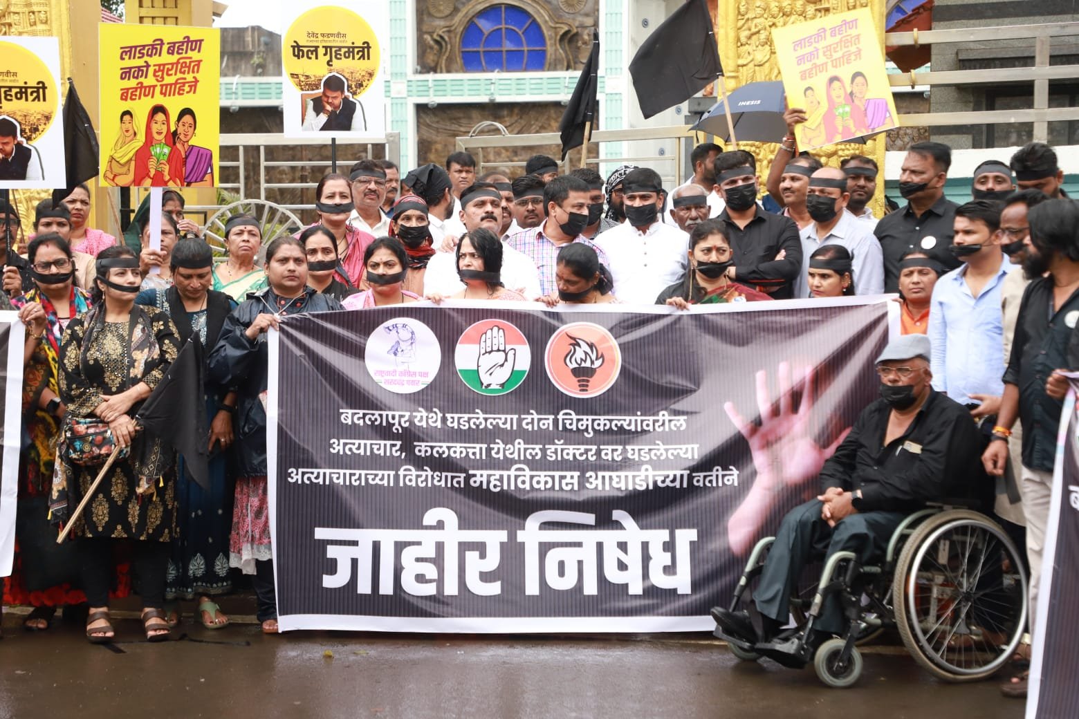 पिंपरी, (महाराष्ट्र ब्रेकिंग न्यूज ) – बदलापूर, छत्रपती संभाजीनगर, अकोला, पुणे, नाशिक, कोल्हापूर येथे घडलेल्या घटनेच्या निषेधार्थ महाविकास आघाडीच्या सर्व पदाधिकारी व कार्यकर्ते यांनी आज  पिंपरी येथील डॉ. बाबासाहेब आंबेडकर चौक येथे तोंडाला काळ्या पट्ट्या बांधून आणि हातात काळे झेंडे घेऊन महिला विरोधी महायुती सरकारचा निषेध व्यक्त करण्यात आला.
