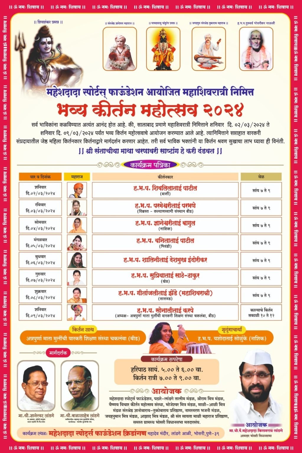 भोसरीतील महेशदादा स्पोर्ट्स फाउंडेशनच्या मैदानावर शनिवार, दि. २ मार्च ते दि. ९ मार्च असे आठ दिवस हा भक्तीमय सोहळा रंगणार आहे. रोज सायंकाळी ५ ते ६ या वेळेत हरिपाठ आणि ७ ते ९ यावेळेत कीर्तन होणार आहे. बार्शी येथील ह.भ.प. शिवलीला पाटील, बीड येथील ह.भ.प. परमेश्वरी परभणे, नाशिक येथील ह.भ.प. ज्ञानेश्वरी बागुल, भिवंडी येथील ह.भ.प. वनिता पाटील, ह.भ.प. शालिनी देशमुख-इंदोरीकर, खेड येथील ह.भ.प. सुप्रिया साठे-ठाकूर, सासवड येथील ह.भ.प. गीतांजली झेंडे आणि बीड येथील ह.भ.प. सोनाली करपे कीर्तनसेवा करणार आहेत. बीड येथील अन्नपूर्णा माता मुलींची वारकरी शिक्षण संस्था कीर्तन साथ देणार आहे. तसेच, मृदुंगाचार्या ह.भ.प. यशोदा सोळुंके याही योगदान देणार आहेत.