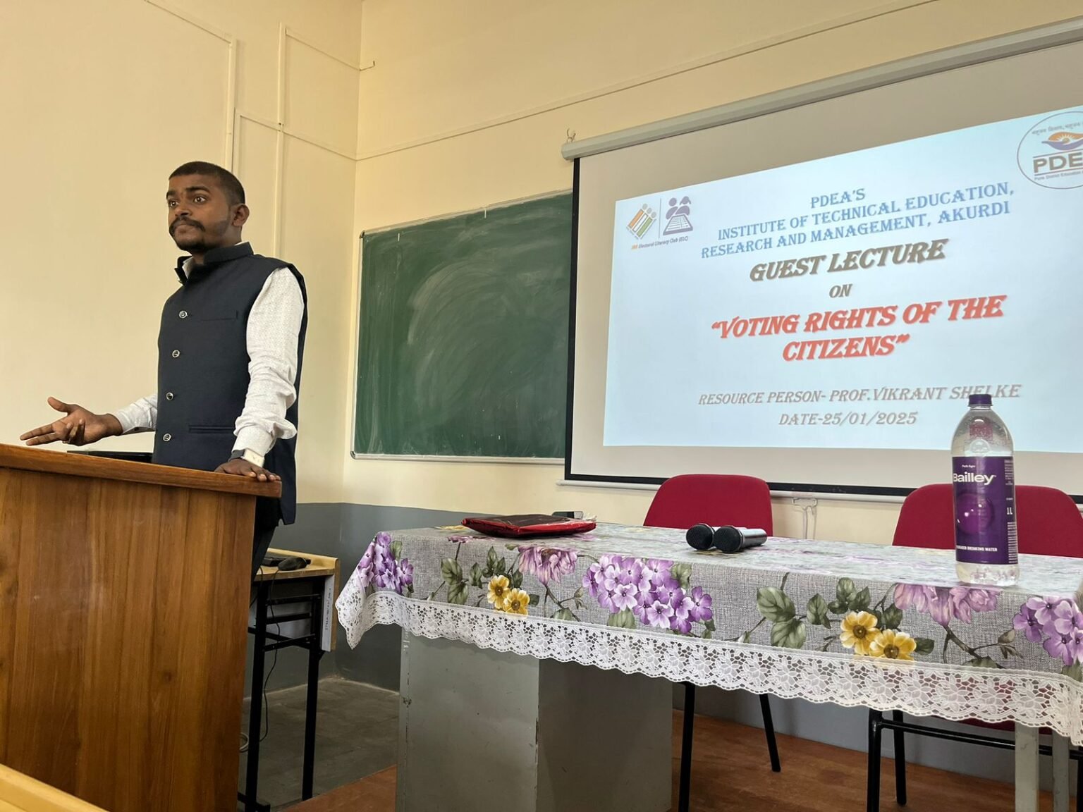 आकुर्डी, (महाराष्ट्र ब्रेकिंग न्यूज ) – पुणे जिल्हा शिक्षण मंडळाचे इन्स्टिट्यूट ऑफ टेक्निकल एज्युकेशन, रिसर्च अँड मॅनेजमेंट, आकुर्डी या महाविद्यालयातर्फे दिनांक २५/०१/२०२५ रोजी निवडणूक साक्षरता क्लब कडून राष्ट्रीय मतदार दिवसानिमित्त “नागरिकांचा मतदानाचा हक्क” या विषयावर  विक्रांत शेळके (सहाय्यक प्राध्यापक,प्रा.रामकृष्ण मोरे कॉलेज, आकुर्डी ) यांच्या गेस्ट लेक्चरचे आयोजन करण्यात आले होते. महाविद्यालयाचे संचालक डॉ. संतोष खलाटे यांच्या मार्गदर्शनाखाली हा कार्यक्रम घेण्यात आला.