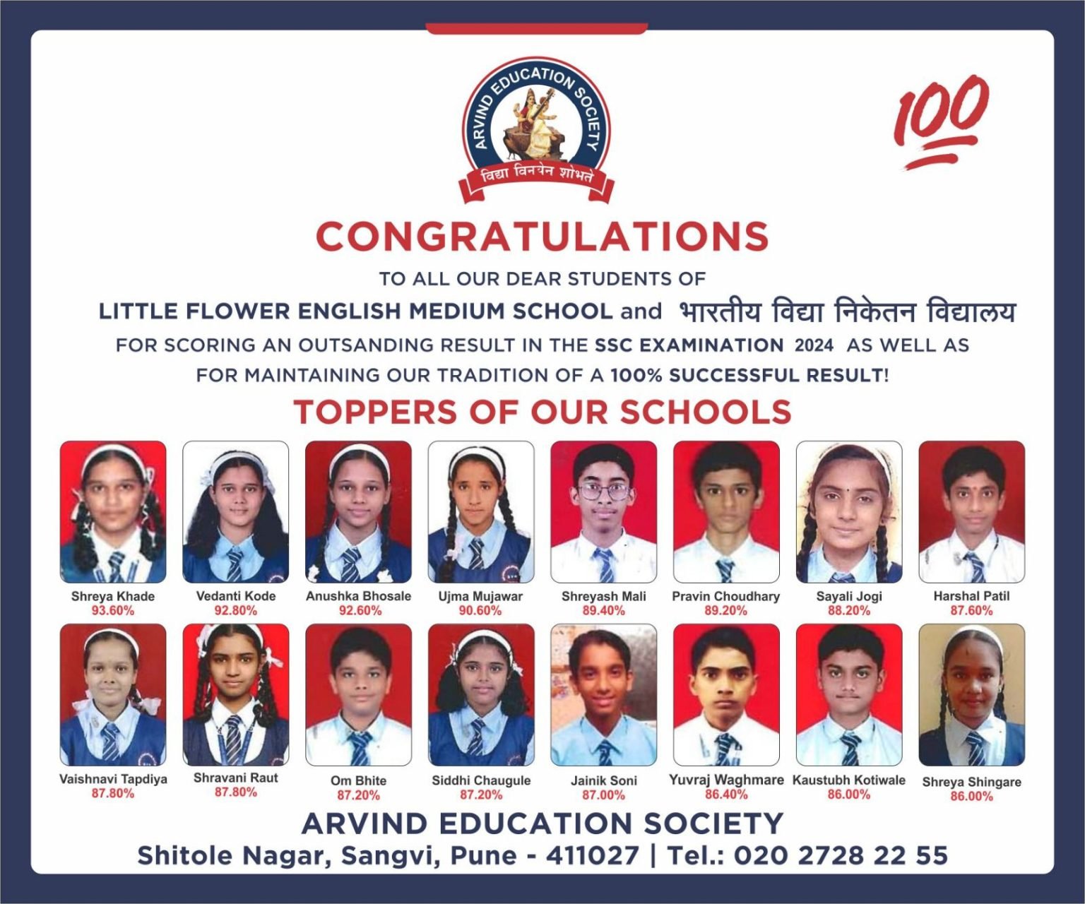 विद्यार्थ्यांच्या या यशाबद्दल अरविंद एज्युकेशन सोसायटीच्या अध्यक्षा आरती राव, सचिव प्रणव राव, लिटल फ्लॉवर स्कुलच्या मुख्याध्यापिका नीलम पवार, भारतीय विद्यानिकेतनच्या मुख्याध्यापिका आशा घोरपडे, शिक्षकवृंद, शिक्षकेतर कर्मचारी यांनी अभिनंदन करीत शुभेच्छा दिल्या.