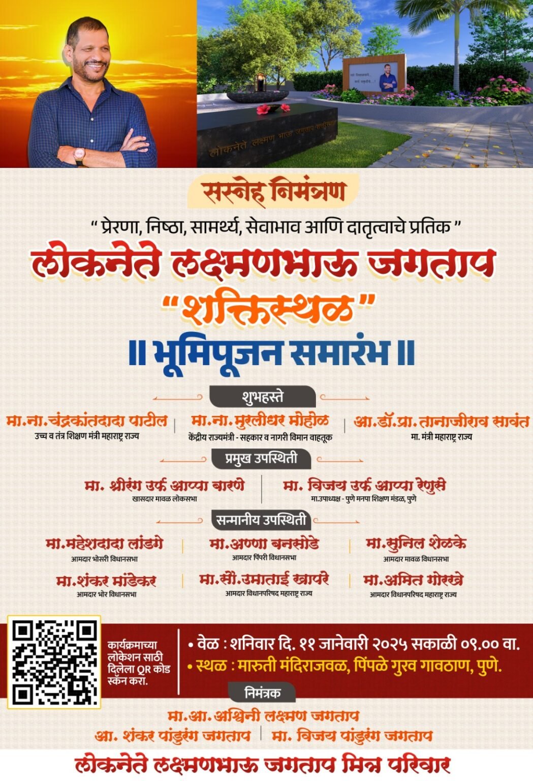 सांगवी,(महाराष्ट्र ब्रेकिंग न्यूज ) – पिंपळे गुरव येथे लोकनेते लक्ष्मणभाऊ जगताप ‘शक्तिस्थळ’ या प्रकल्पाचे भूमिपूजन होणार आहे. या विशेष सोहळ्याचे आयोजन आज , शनिवार, ११ जानेवारी २०२५ रोजी सकाळी ९ वाजता मारुती मंदिराजवळ, पिंपळे गुरव गावठाण, पुणे येथे करण्यात आले आहे.