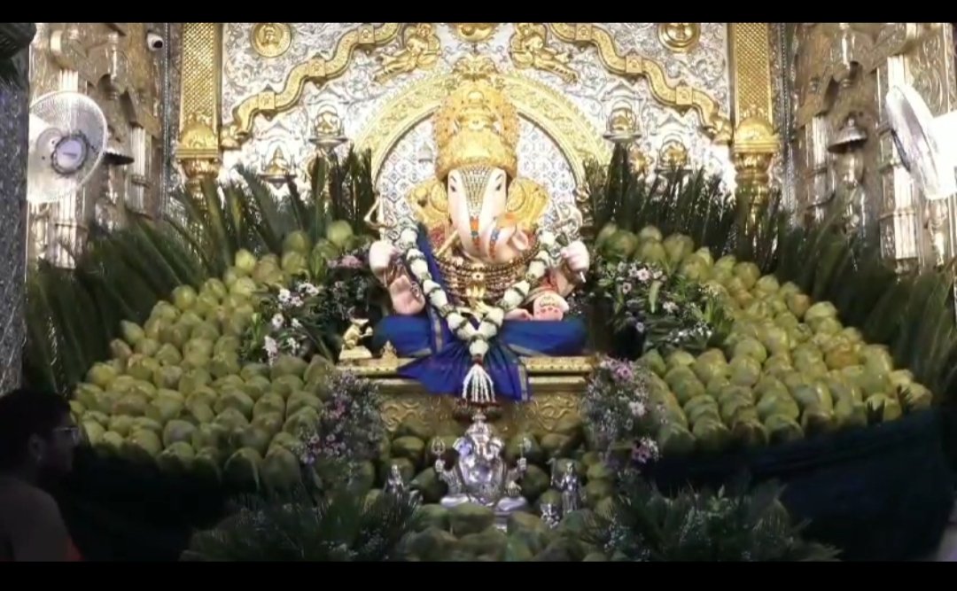 पुणे, (महाराष्ट्र ब्रेकिंग न्यूज) –  श्रीमंत दगडूशेठ हलवाई सार्वजनिक गणपती ट्रस्ट व सुवर्णयुग तरुण मंडळातर्फे आज मंदिरात शहाळे महोत्सव आयोजित करण्यात आला आहे. गणपती बाप्पांना तब्बल ५ हजार शहाळ्यांचा महानैवेद्य अर्पण करण्यात आला.अशी माहिती ट्रस्टचे अध्यक्ष माणिक चव्हाण यांनी दिली.
