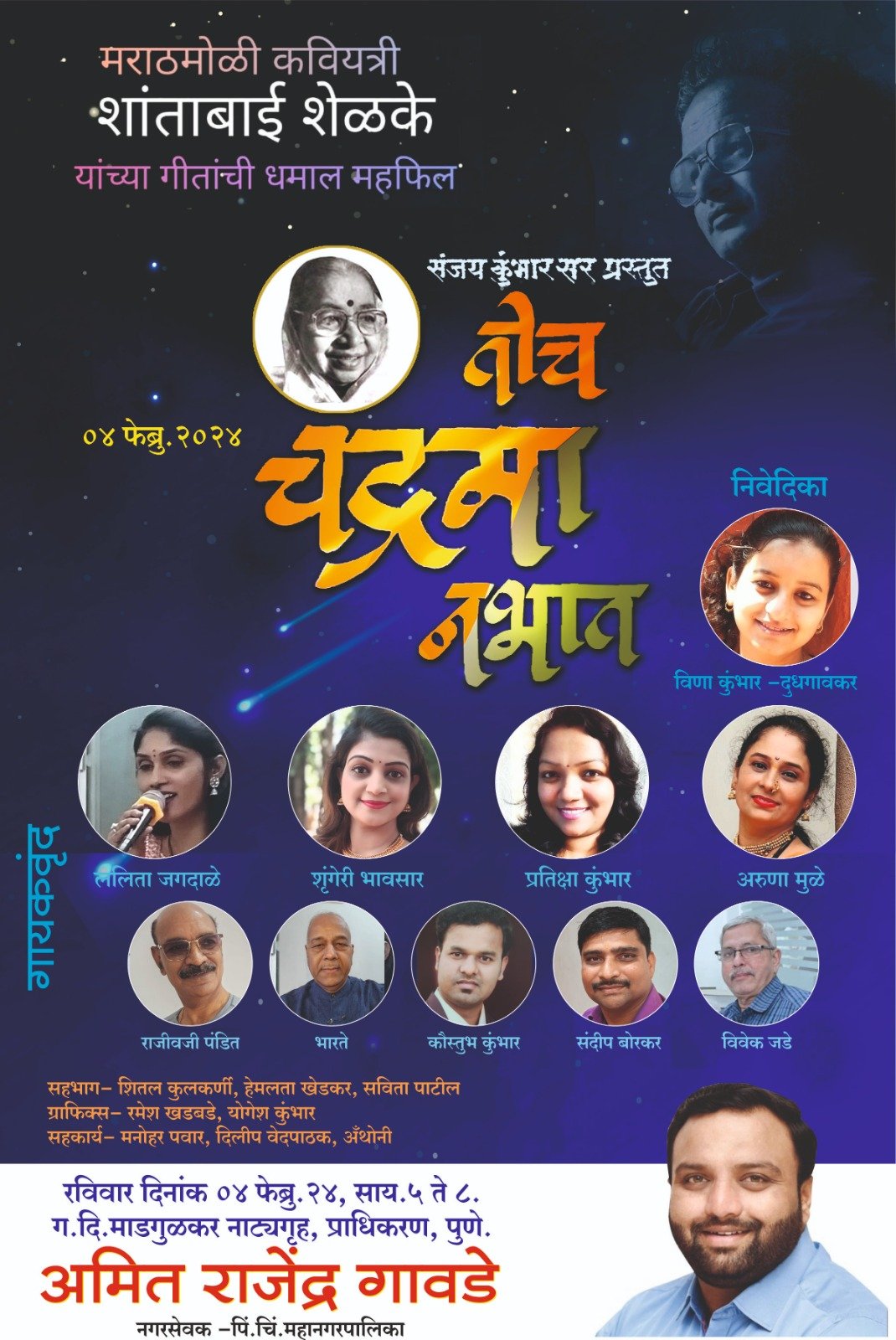 निगडी,  (महाराष्ट्र ब्रेकिंग न्यूज)- संजय कुंभार प्रस्तुत तोच चंद्रमा नभात मराठमोळी कवियत्री शांताबाई शेळके यांच्या गीतांची महफील 4 फेब्रुवारी रविवारी येथे सायंकाळी 5 ते 8 या वेळेत प्राधिकरण येथील ग.दि. माडगूळकर नाट्यगृहात आयोजित केली आहे. कार्यक्रमाचे आयोजक अमित गावडे आहेत.