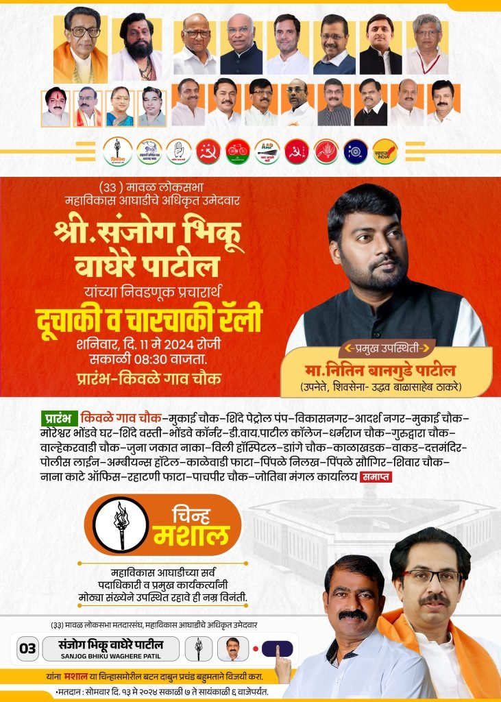 उमेदवार संजोग वाघेरे पाटील यांच्यासोबत उपनेते व व्याख्याते प्रा. नितीन बानगुडे पाटील या रॅलीमध्ये सहभागी होतील. त्यांच्यासोबक पिंपरी चिंचवड शहरातील महाविकास आघाडीतील शिवसेनेसह सर्व घटक पक्ष, संघटना यांचे पदाधिकारी, कार्यकर्ते या रॅलीमध्ये सहभागी होणार आहेत.