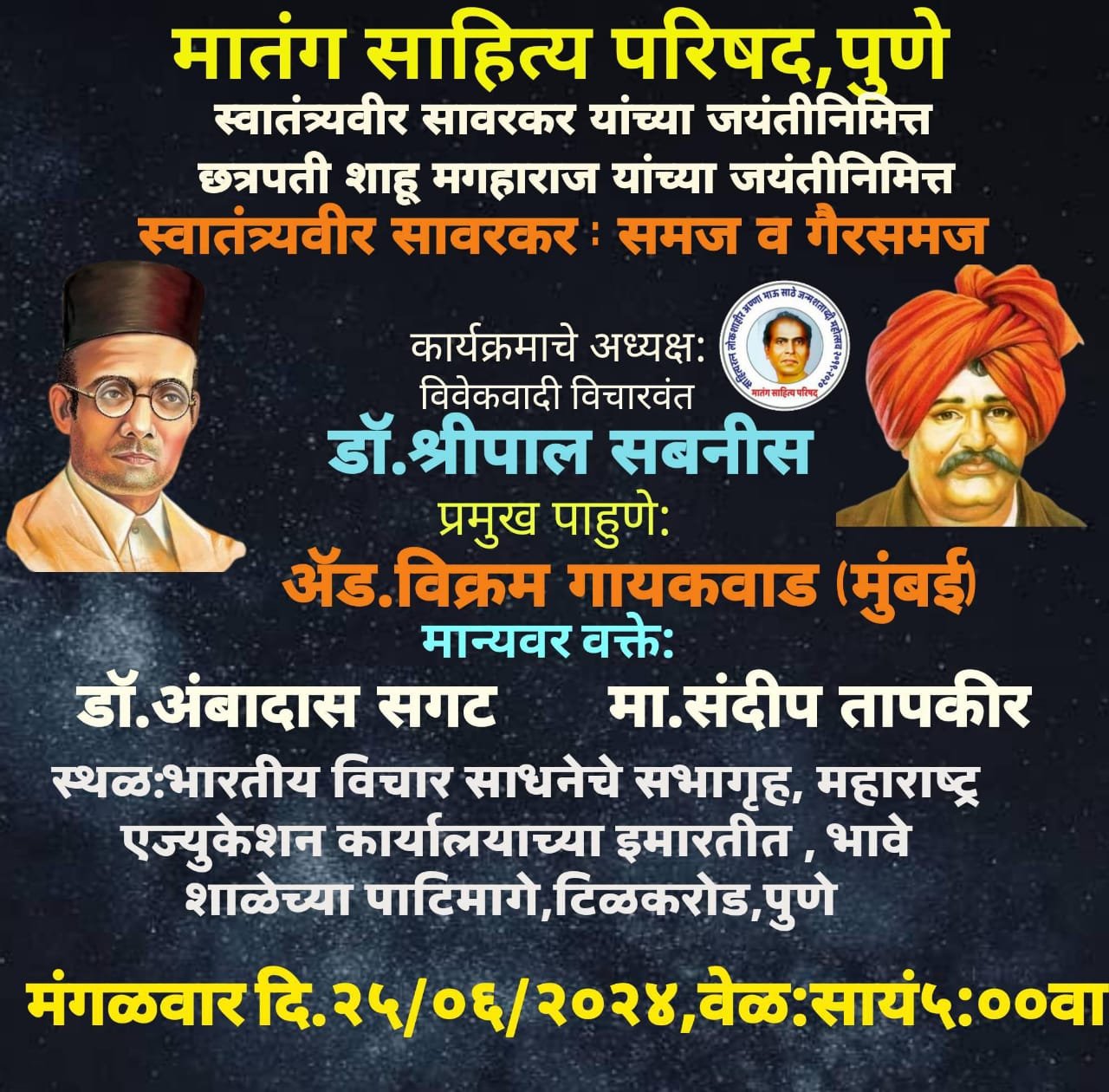 पुणे, (महाराष्ट्र ब्रेकिंग न्यूज) – मातंग साहित्य परिषद पुणे यांच्या वतीने स्वातंत्र्यवीर सावरकर व छत्रपती शाहू महाराज यांच्या जयंतीनिमित्त ‘ स्वातंत्र्यवीर सावरकर : समज व गैरसमज ‘ या विषयावर पुण्यात विवेकवादी विचारवंत डॉ.श्रीपाल सबनीस यांच्या अध्यक्षतेखाली परिसंवादाचे आयोजन मंगळवार दि.२५/०६/२०२४ रोजी सायं ५.००वा. भारतीय विचार साधनेचे सभागृह, भावे शाळेच्या पाटी मागे,पेरुगेट,टिळक रोड, पुणे येथे करण्यात आले आहे.