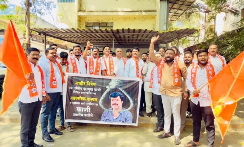 गेली दोन दिवसांपासून स्व. संतोष देशमुख यांच्या हत्येचे सोशल माध्यमावर वायरल झालेले फोटो माणुसकीला काळीमा फासणारे व तीव्र संताप आणणारे आहेत. याप्रकरणी अटकेत असलेल्या वाल्मीक कराड व सर्व आरोपींना लवकरात लवकर फाशीची शिक्षा दिली जावी, असे मत यावेळी शिवसैनिकांनी व्यक्त केले.