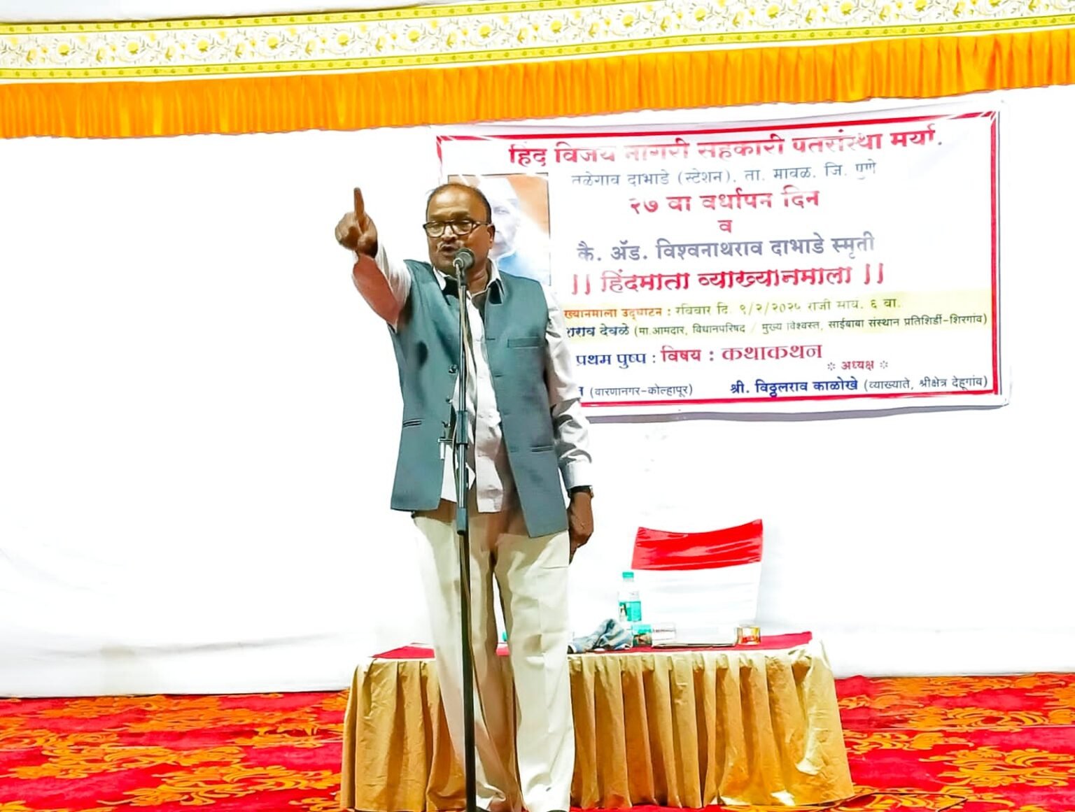 तळेगाव दाभाडे येथील हिंदविजय नागरी सहकारी पतसंस्थेच्या २७व्या वर्धापनदिनानिमित्त कै. अॅड. विश्वनाथराव दाभाडे स्मृती हिंदमाता व्याख्यानमालेचे पहिले पुष्प गुंफत प्रा. खोत यांनी रसिकांना मंत्रमुग्ध केले. या व्याख्यानमालेचे उद्घाटन प्रतिशिर्डी शिरगावच्या श्री साईबाबा संस्थानचे मुख्य विश्वस्त माजी आमदार प्रकाश देवळे यांच्या हस्ते झाले. अध्यक्षस्थानी विठ्ठलराव काळोखे होते. दरम्यान, ज्येष्ठ साहित्यिक प्रभाकर ओव्हाळ यांना ‘हिंदविजय भूषण पुरस्कारा’ने गौरवण्यात आले. यावेळी डॉ. कृष्णकांत वाढोकर, हिंदविजय पतसंस्थेचे संस्थापक अॅड. रविंद्रनाथ दाभाडे, भास्करराव म्हाळसकर, माजी नगराध्यक्ष सुरेश धोत्रे, संस्थेच्या अध्यक्षा विभावरी दाभाडे, माजी अध्यक्ष राजेश सरोदे, उपाध्यक्ष अॅड. संजय वांद्रे, सचिव कैलास भेगडे, प्रदीप गटे, नामदेव आंद्रे, श्रीकृष्ण पुरंदरे, श्रीकृष्ण मुळे, प्रमोद देशक, आनंदराव देशमुख, सुधाकर देशमुख, अॅड. निवृत्ती फलके आदी मान्यवर उपस्थित होते.