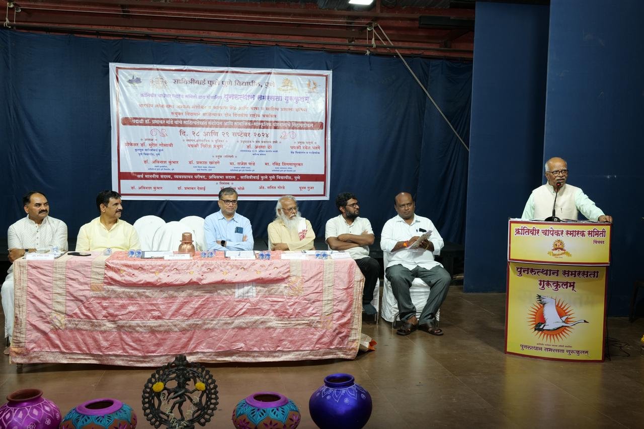 सावित्रीबाई फुले पुणे विद्यापीठ (भारतीय लोककला अभ्यास संशोधन व कल्याण केंद्र आणि भाषा व साहित्य प्रशाला) आणि क्रांतिवीर चापेकर स्मारक समिती संचलित पुनरुत्थान समरसता गुरुकुलम् यांच्या संयुक्त विद्यमाने आयोजित दोन दिवसीय राष्ट्रीय चर्चासत्राच्या समारोप सत्रात भूमिका व्यक्त करताना पद्मश्री रमेश पतंगे बोलत होते. याप्रसंगी क्रांतिवीर चापेकर स्मारक समिती अध्यक्ष पद्मश्री गिरीश प्रभुणे, कार्यवाह ॲड. सतिश गोरडे, सावित्रीबाई फुले पुणे विद्यापीठाचे प्रभारी कुलसचिव डॉ. अविनाश कुंभार, अधिष्ठाता डॉ. प्रभाकर देसाई, प्रांत मंत्री किशोर चव्हाण यांची व्यासपीठावर तसेच मांडे कुटुंबीयांसह विविध क्षेत्रातील मान्यवरांची सभागृहात उपस्थिती होती.