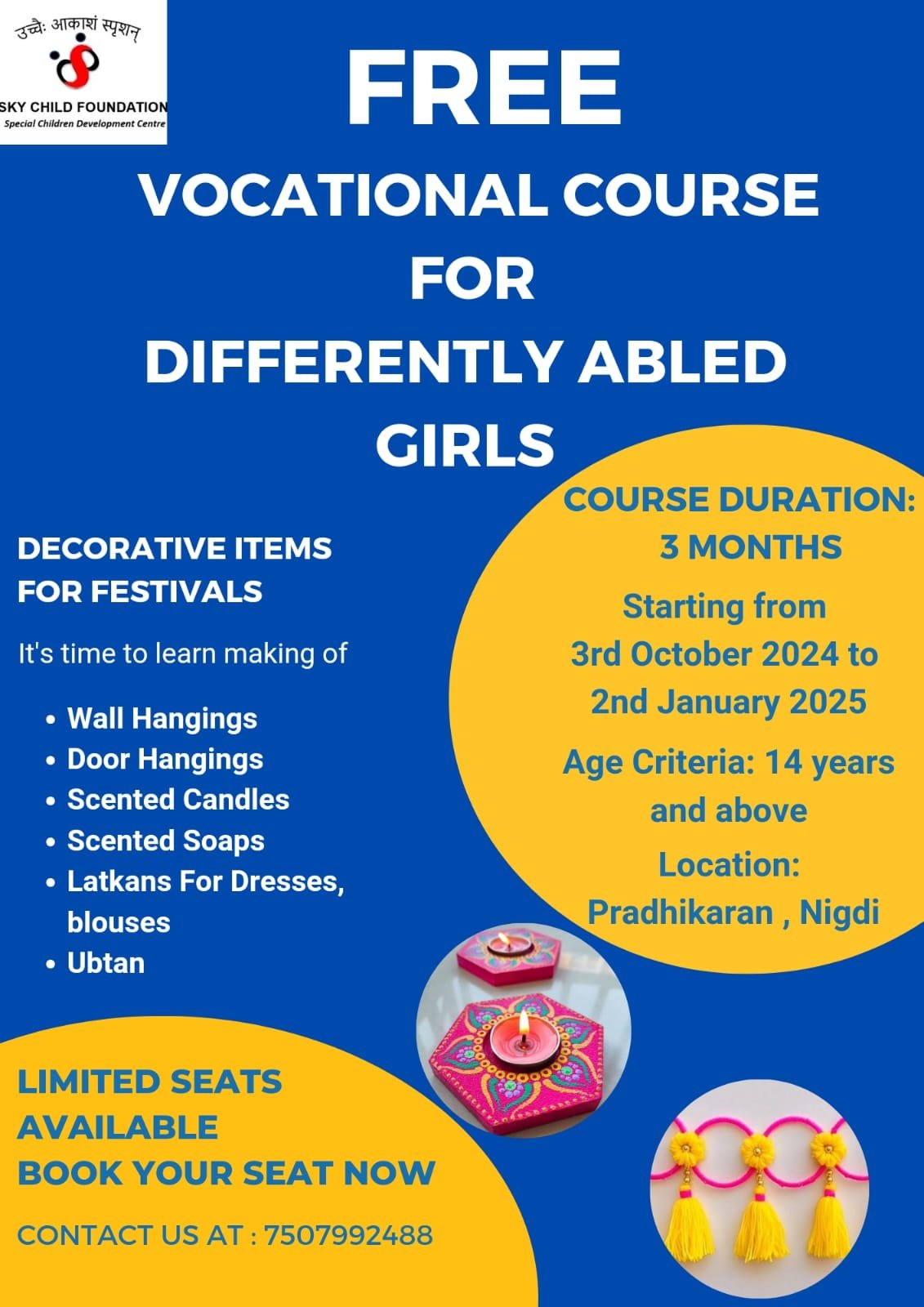 समाजातील चौदा वर्षे आणि त्यापेक्षा अधिक वयाच्या दिव्यांग मुली आणि महिला यांच्या अंगभूत सुप्त कौशल्याला वाव मिळवून देत त्यांच्यातील स्वावलंबनाची भावना वृद्धिंगत व्हावी हा या प्रशिक्षणाचा उद्देश आहे. यामध्ये भिंतीवरील शोभिवंत वस्तू (वॉल हँगिंग), दारावरील तोरण, सुगंधी मेणबत्ती, सुगंधी साबण, सुगंधी उटणे, महिलांच्या पोशाखावरील कलाकुसर बनविणे अशा विविध कौशल्यांचे प्रशिक्षण देण्यात येईल. प्रशिक्षणार्थींच्या जागा मर्यादित असल्याने इच्छुकांच्या पालकांनी ७५०७९९२४८८ या भ्रमणध्वनी क्रमांकावर नोंदणी करावी, असे आवाहन  स्काय चाईल्ड फाउंडेशनच्या संस्थापिका सोनाली पलांडे यांनी केले आहे.