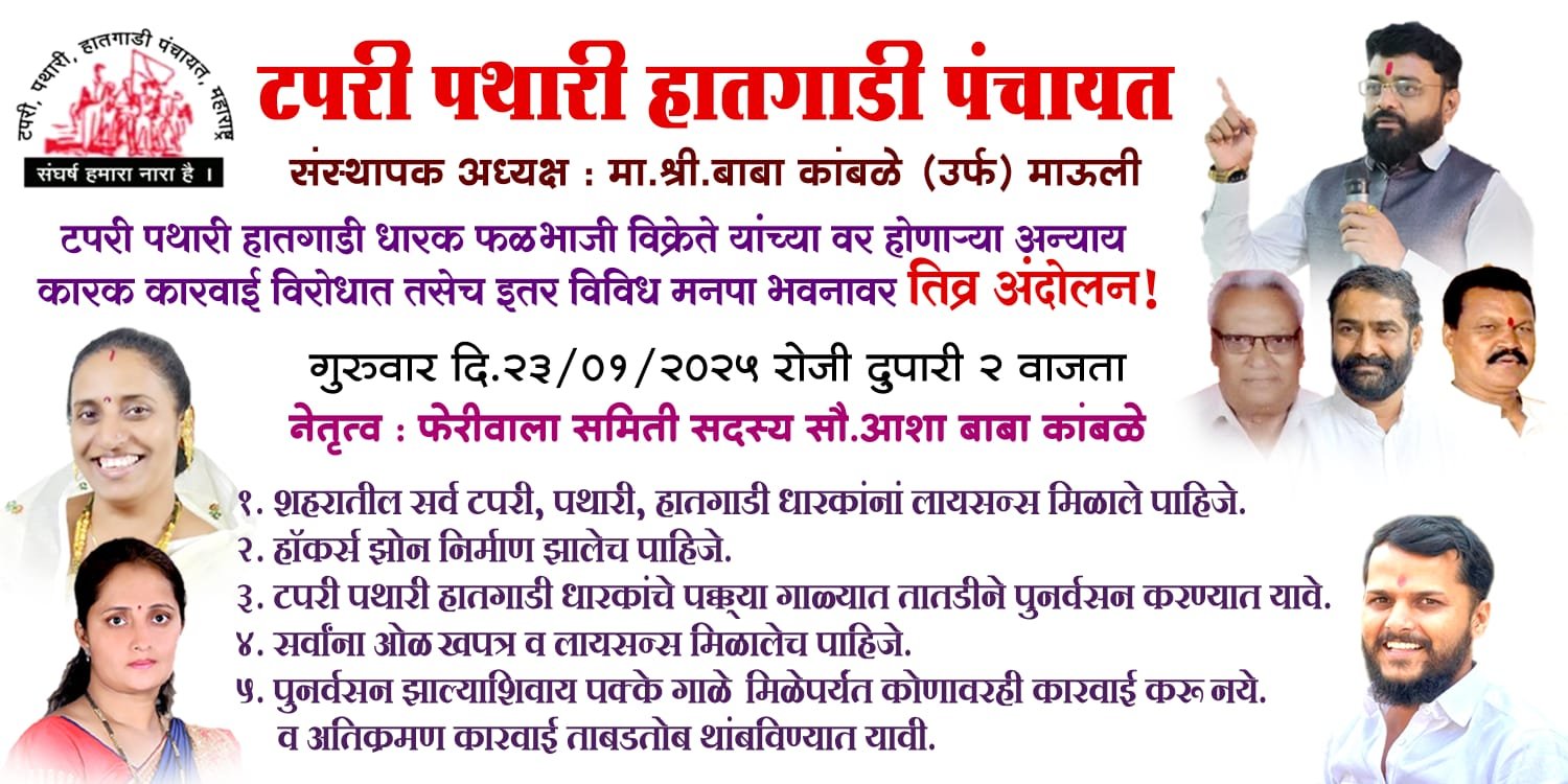 पिंपरी, (महाराष्ट्र ब्रेकिंग न्यूज ) – अनेक वर्षांपासून रखडलेल्या मागणीकडे दुर्लक्ष केले जात आहे. तसेच शुल्क घेऊनही परवाना वाटप झाला नाही. फेरीवाल्यांवर चुकीच्या पद्धतीने कारवाई सुरू आहे. यासह अनेक मागण्यांसाठी शहरातील फेरीवाल्यांचा मोर्चा आज गुरुवारी (दि. २३) पिंपरी चिंचवड महापालिकेवर धडकणार आहे. टपरी, पथारी हातगाडी पंचायतच्या वतीने फेरीवाला समितीच्या सदस्या आशा बाबा कांबळे यांच्या नेतृत्वात दुपारी दोन वाजता हे आंदोलन होणार आहे.