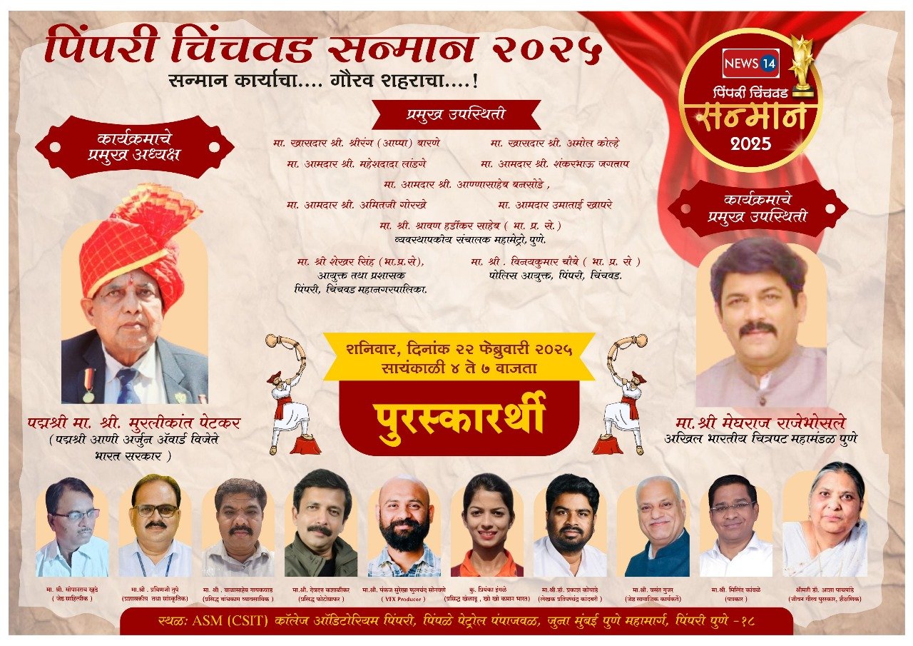 पिंपरी,(महाराष्ट्र ब्रेकिंग न्यूज) – शहराच्या प्रगतीसाठी मोलाचे योगदान देणाऱ्या व्यक्तींना सन्मानित करण्याची परंपरा News14 Media Network सातत्याने जपते आहे. यावर्षीही ‘पिंपरी चिंचवड सन्मान २०२५’ पुरस्कारांचे मानकरी जाहीर करण्यात आले असून, ११ कर्तृत्ववान व्यक्तींना गौरवण्यात येणार आहे. हा भव्य सोहळा २२ फेब्रुवारी २०२५ रोजी संध्याकाळी ४ ते ७ वाजता ASM Group च्या CSIT पिंपरी येथील सभागृहात पार पडणार आहे.