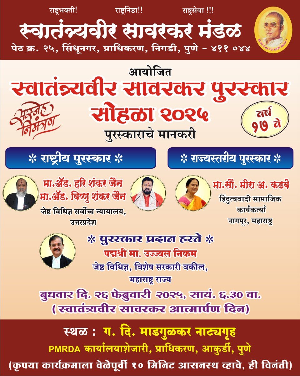 स्वातंत्र्यवीर सावरकर पुरस्काराचे वितरण आकुर्डीतील ग.दि. माडगूळकर नाट्यगृहात आज 26 फेब्रुवारी रोजी सायंकाळी साडेसहा वाजता करण्यात येणार आहे. मंडळातर्फे यंदा स्वातंत्र्यवीर सावरकर राष्ट्रीय पुरस्कार उत्तरप्रदेश मधील सर्वोच्च न्यायालयाचे जेष्ठ विधिज्ञ ॲड. हरि शंकर जैन, ॲड. विष्णु शंकर जैन यांना जाहीर करण्यात आला आहे.