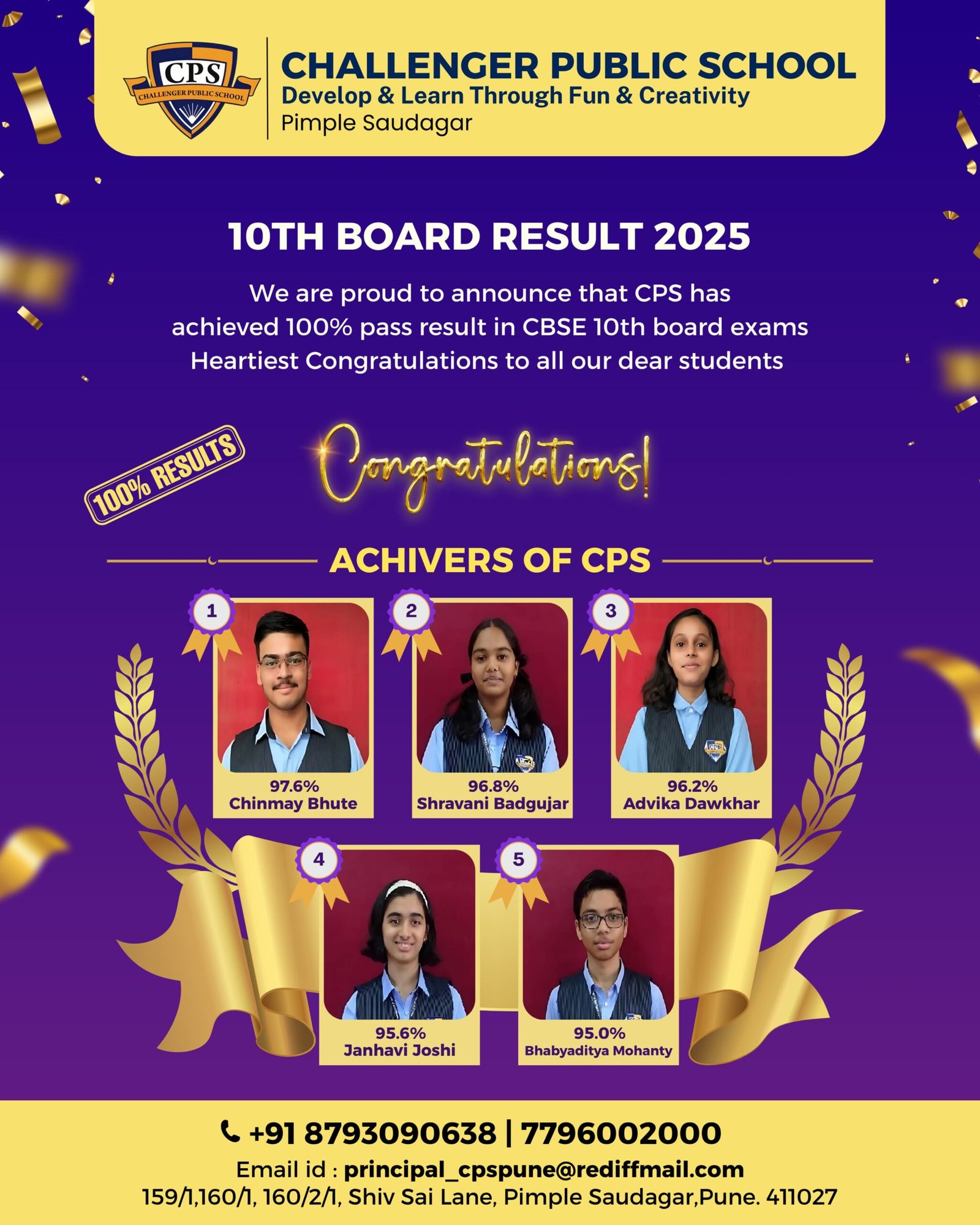 सर्व प्रिय पालकांचे आणि शिक्षकांचे सतत प्रोत्साहन, विश्वास आणि सहकार्याबद्दल चेअरमनने आभार मानले.चॅलेंजर पब्लिक शाळेचा सतत पाच वर्ष शंभर टक्के निकाल लागत आहे.