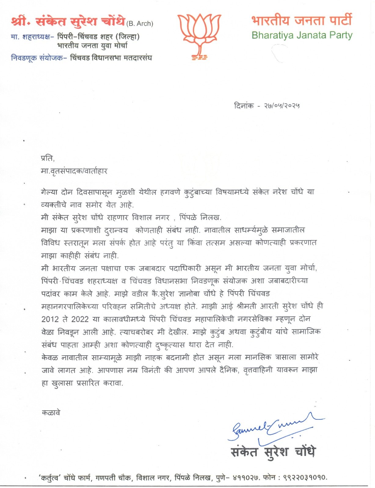 व्यक्तीचे नाव समोर येत आहे.मी संकेत सुरेश चोंधे( I am Sanket Suresh chaundhe ) राहणार विशाल नगर, पिंपळे निलख.माझा या प्रकरणाशी दुरान्वय कोणताही संबंध नाही. नावातील साधर्म्यमुळे समाजातील विविध स्तरातून मला संपर्क होत आहे परंतु या किंवा तत्सम असल्या कोणत्याही प्रकरणातमाझा काहीही संबंध नाही, असा खुलासा संकेत सुरेश चौँधे यांनी प्रसिद्धी पत्रकाद्वारे केला आहे.