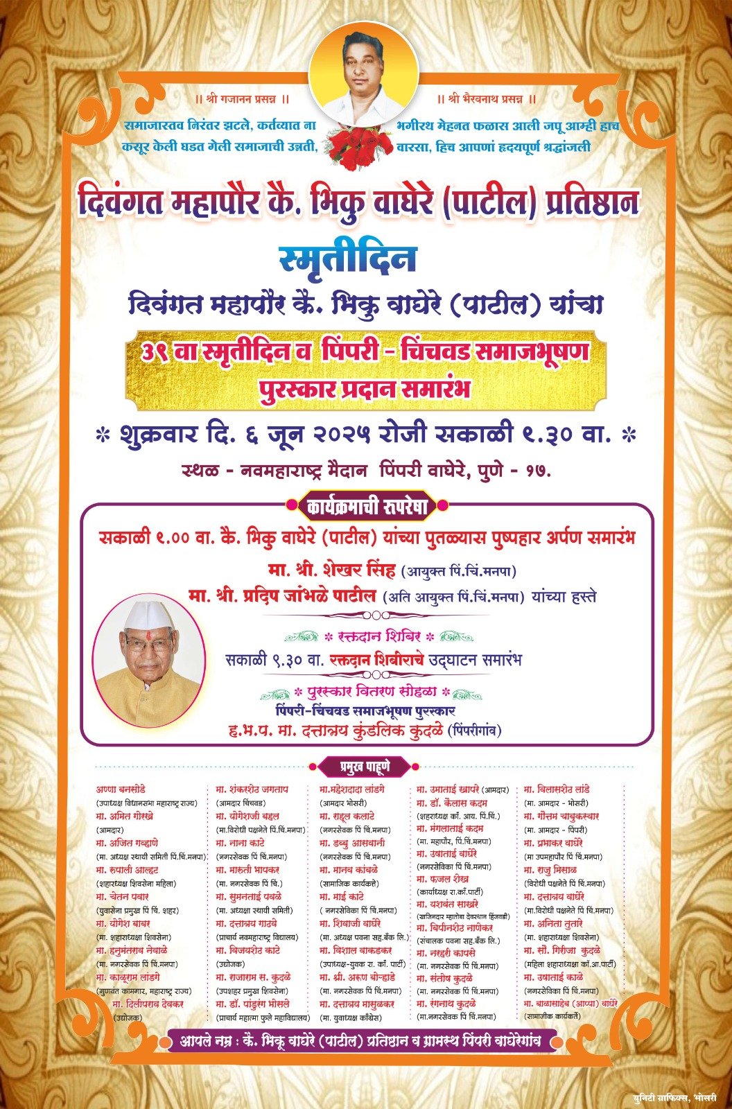 संजोग वाघेरे पाटील यांनी सांगितले की, दिवंगत महापौर कै. भिकू वाघेरे पाटील यांच्या स्मृतीदिनानिमित्त विविध कार्यक्रमाचे आयोजन करण्यात आले आहे. पिंपरी-चिंचवड महापालिकेचे आयुक्त तथा प्रशासक शेखर सिंह आणि अतिरिक्त आयुक्त प्रदीप जांभळे पाटील यांच्या हस्ते कै. भिकू वाघेरे पाटील यांच्या पुतळ्यास सकाळी नऊ वाजता पुष्पहार अर्पण करून अभिवादन करण्यात येणार आहे. त्यानंतर सकाळी 9.30 वाजता रक्तदान शिबिराचे उद्घाटन केले जाईल. तसेच, पुरस्कार वितरण सोहळ्यात पिंपरी वाघेरे येथील ह.भ.प. दत्तात्रय कुदळे यांना पिंपरी-चिंचवड समाजभूषण पुरस्कार देऊन सन्मानित केले जाणार आहे.