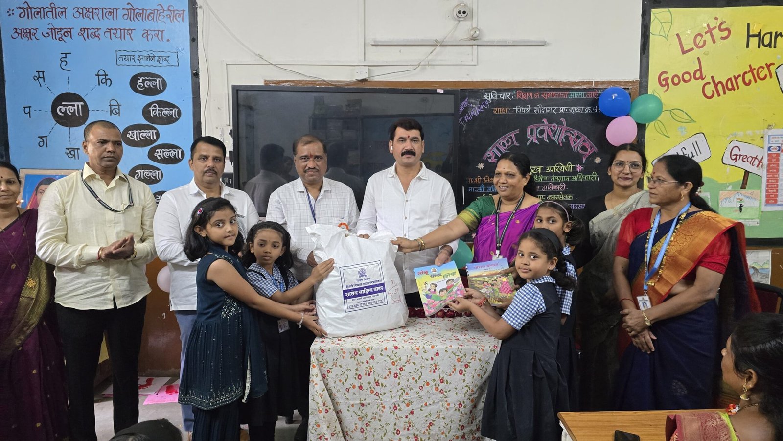 तसेच विठ्ठल उर्फ नाना काटे हस्ते प्रथम दिवसाचे आकर्षण असणारी शालेय पाठयपुस्तकांचे व शालेय वस्तूंचे किट तसेच गणवेश वाटप यावेळी विद्यार्थ्यांना करण्यात आले.