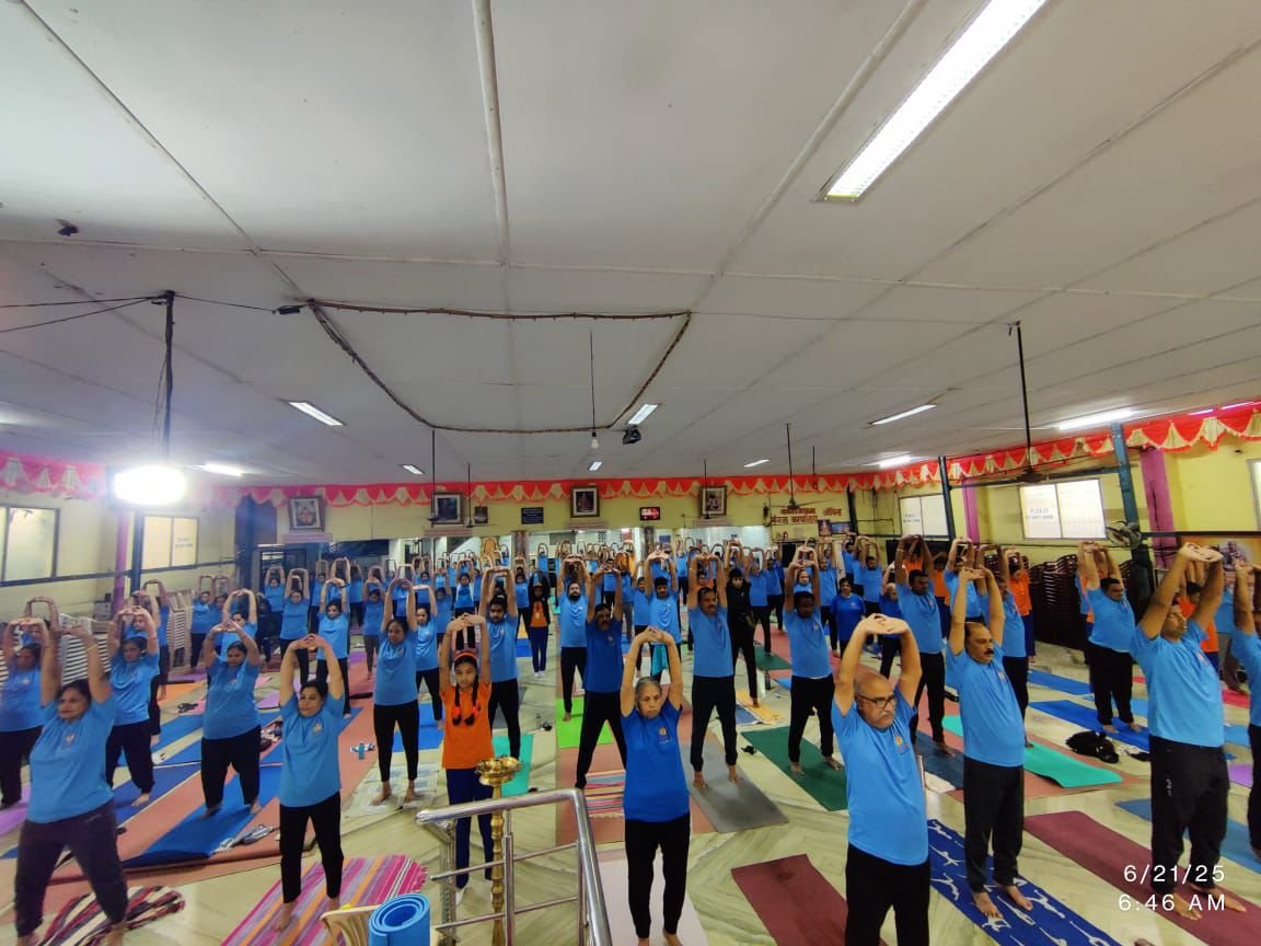 योग शिक्षक दिगंबर उचगांवकर व अनुजा उचगांवकर यांनी सर्वांना योगाचे धडे दिले. सुरुवातीला योगासाठीच्या पूरक हालचाली झाल्या. त्यानंतर सूर्यनमस्कार झाले. शय स्थितीमधील पवन मुक्तासन, शेतु बंधासन झाले. बैठक स्थितीमधील वज्राअसान, शशांक आसन, दंड स्थितीतील वृक्षासन, ताडासन आणि त्रिकोण आसन झाले. प्राणायाम, कपालभाती, अनुलो मिलोम, ब्राम्हरी प्राणायाम झाले. विश्वशांती प्रार्थनेने समारोप झाला. योग कार्यक्रमात परिसरातील ६०० जणांनी सहभाग घेतला. युनिक व्हिजन स्कुलचे विद्यार्थी, शिक्षकही सहभागी झाले होते.