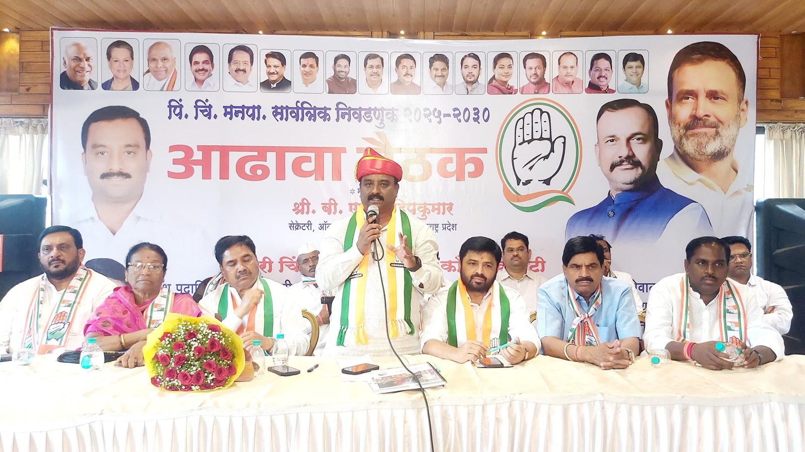 पिंपरी, (महाराष्ट्र ब्रेकिंग न्यूज) – पिंपरी चिंचवड महानगरपालिका निवडणुक २०२५ करीता शहर काँग्रेस कमिटी च्यावतीने करण्यात येत असलेल्या नियोजना बाबत अखिल भारतीय काँग्रेस कमिटीचे सेक्रेटरी तथा महाराष्ट्र प्रदेश काँग्रेस कमिटीचे सह-प्रभारी श्री बी एल संदीप कुमार यांच्या उपस्थितीत आढावा बैठक डांगे चौक, थेरगाव येथे घेण्यात आली. यावेळी शहराध्यक्ष डॉ.कैलास कदम यांच्या हस्ते महाराष्ट्र प्रदेश काँग्रेस कमिटीचे सह-प्रभारी श्री बी एल संदीप कुमार यांना पुणेरी पगडी, शाल व पुष्पगुच्छ देऊन स्वागत करण्यात आले.