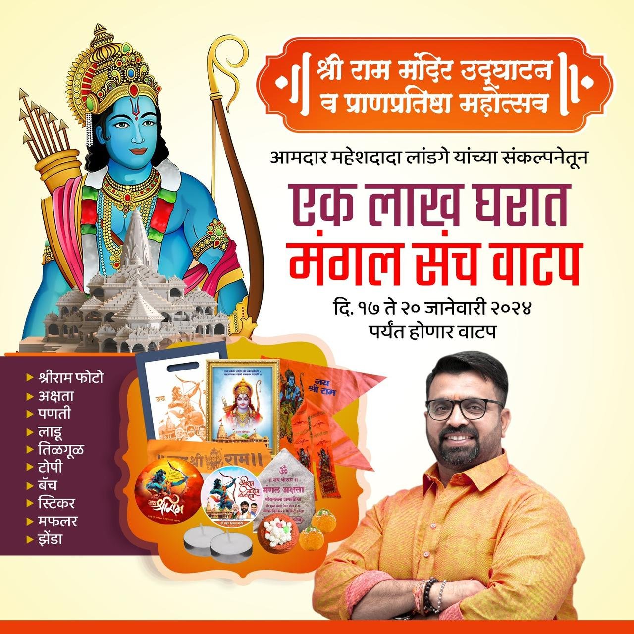 ‘मंगल संच’ मध्ये प्रभू श्रीराम प्रतिमा, मंगल अक्षता, भगवा ध्वज, प्रसाद, घराच्या प्रवेशद्वारावर चिटकवण्यासाठी स्टिकर, रामभक्तांसाठी मफलर, बॅच, भगवी टोपी, पणत्या, तिळगूळ इत्यादी साहित्याचे वाटप दि. १७ ते दि. २० जानेवारीपर्यंत करण्यात येणार आहे.