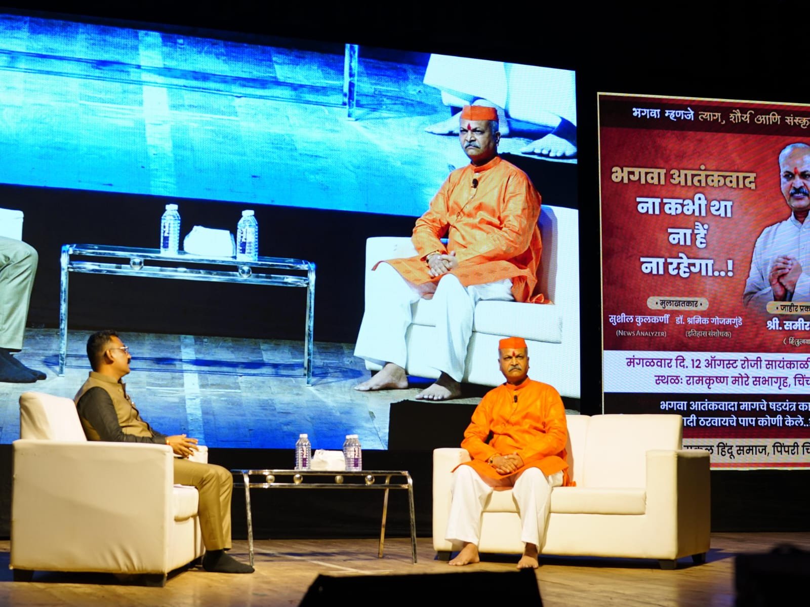 चिंचवड (महाराष्ट्र ब्रेकिंग न्यूज) -‘भगवा आतंकवाद हे पुराव्याशिवाय केले गेलेले भारताच्या इतिहासातील एक मोठे षडयंत्र होते, हे षडयंत्र तत्कालीन काँग्रेस सरकारचेच असल्याचा घणाघाती गौप्यस्फोट मालेगाव बॉम्बस्फोट प्रकरणातील निर्दोष मुक्तता झालेले समीर कुलकर्णी यांनी केला. धर्मपरायण राहून राष्ट्रकर्तव्य केल्यास हिंदुधर्म कधीही पराजित होणार नाही!’ असा ठाम विश्वासदेखील त्यांनी (दिनांक १२ ऑगस्ट २०२५) चिंचवड येथे व्यक्त केला. सकल हिंदू समाज, पिंपरी – चिंचवड शहराच्या वतीने इतिहास संशोधक डॉ. श्रमिक गोजमगुंडे यांनी ‘भगवा आतंकवाद ना कभी था… ना हैं… ना रहेगा…’ या विषयावर समीर कुलकर्णी यांचीजाहीर प्रकट मुलाखत घेतली. भगवा म्हणजे त्याग, शौर्य आणि संस्कृतीचे प्रतीक असल्याने पुरुषार्थ हा हिंदू समाजाचा आदर्श असून हिंदू समाजाने कधीही दहशतवादाचा मार्ग अंगीकारला नाही; परंतु निवडणुका डोळ्यांपुढे ठेवून गलिच्छ राजकारण करणाऱ्या, भगवा आतंकवाद षडयंत्र रचणाऱ्या काँग्रेसला या देशातून हद्दपार करणे हे प्रत्येक हिंदूचे आद्यकर्तव्य असावे, असे प्रतिपादन कुलकर्णी यांनी विस्तृत मुलाखतीच्या माध्यमातून केले. जगद्गुरू संत तुकाराम महाराज श्री क्षेत्र देहू देवस्थानचे विश्वस्त माणिक महाराज मोरे, चिंचवड देवस्थान विश्वस्त जितेंद्र देव महाराज व्यासपीठावर प्रामुख्याने उपस्थित होते.