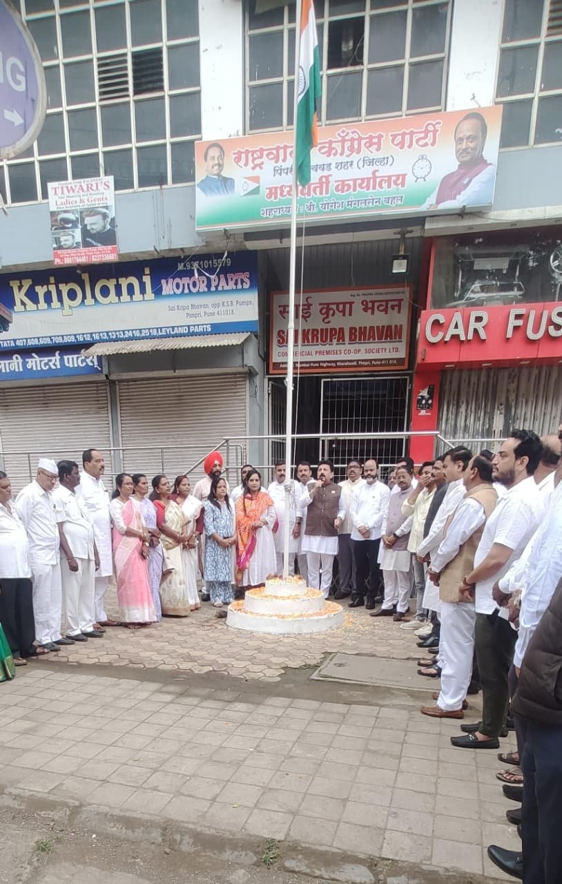 पिंपरी, (महाराष्ट्र ब्रेकिंग न्यूज) – भारताचा ७९ वा स्वातंत्र्य दिन राष्ट्रवादी काँग्रेस पार्टीच्या वतीने मध्यवर्ती पक्ष कार्यालय खराळवाडी, पिंपरी येथे साजरा करण्यात आला. शहराध्यक्ष योगेश बहल यांच्या हस्ते ध्वजारोहण करण्यात आले.