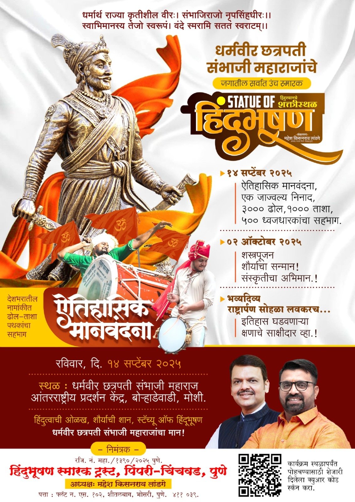 महाराष्ट्रामध्ये ढोल-ताशा या पारंपरिक वादन सोहळ्याला विशेष महत्त्व आहे. ‘राज्य उत्सव’ म्हणून घोषित केलेल्या गणेशोत्सवात ढोल-ताशा पथकांनी अवघ्या देशाचे लक्ष वेधून घेतले. परंपरा आणि संस्कृती जपणाऱ्या ढोल-ताशा महासंघाच्या वतीने जगातील सर्वांत उंच शिल्प ‘‘स्टॅच्यू ऑफ हिंदुभूषण’’ ला मानवंदना देण्याचा संकल्प मांडला होता. त्यानुसार, रविवार, दि. 14 सप्टेंबर 2025 रोजी दुपारी 3 वाजता धर्मवीर छत्रपती संभाजी महाराज आंतरराष्ट्रीय औद्योगिक प्रदर्शन केंद्र, मोशी येथे ऐतिहासिक मानवंदना सोहळा होणार आहे. तसेच, येत्या दि. 2 ऑक्टोबर रोजी छत्रपती संभाजी महाराज पूर्णाकृती शिल्पाच्या तलवारीचे शस्त्रपूजन करण्यात येणार आहे, अशी माहिती हिंदुभूषण स्मारक ट्रस्टचे उपाध्यक्ष गणेश भुजबळ यांनी दिली.