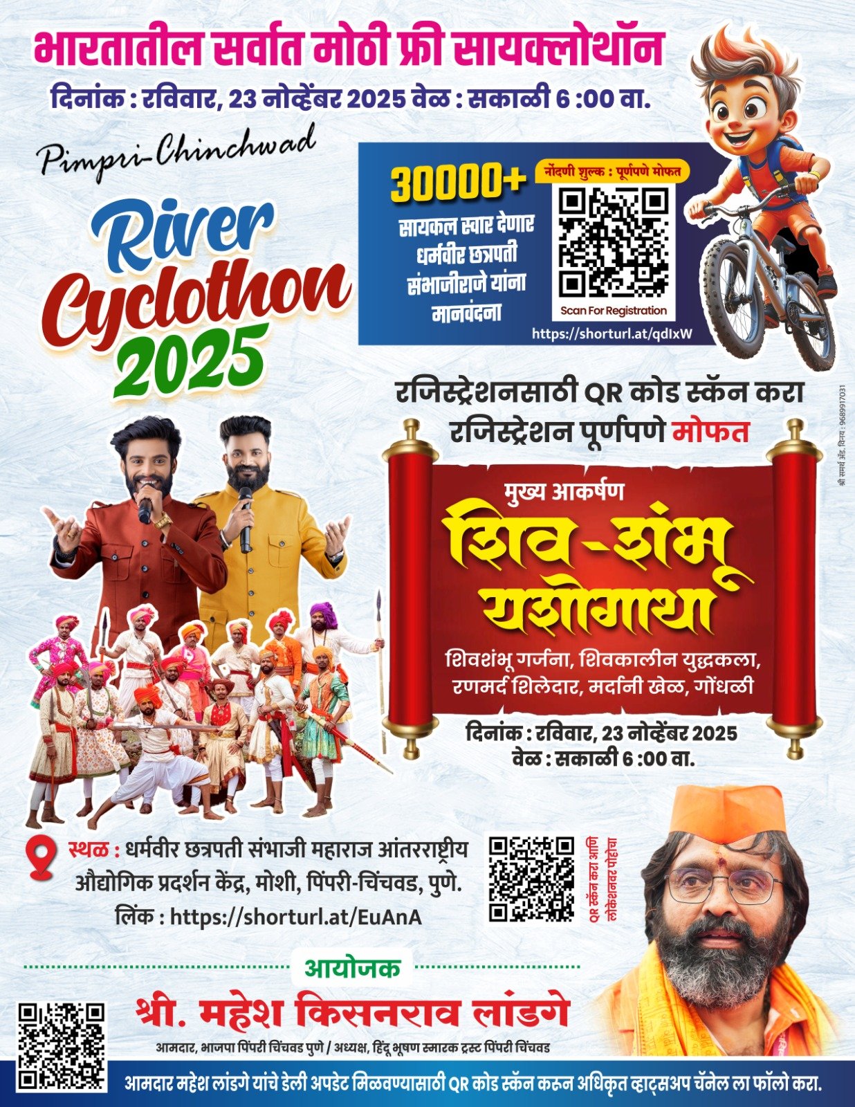 आमदार महेश लांडगे यांच्या संकल्पनेतून प्रतिवर्षी इंद्रायणी रिव्हर सायक्लोथॉनचे आयोजन केले जाते. यावर्षी रविवार, दि. 23 नोव्हेंबर रोजी सकाळी 6 वाजता ‘‘स्टॅच्यू ऑफ हिंदूभूषण’’ धर्मवीर छत्रपती संभाजी महाराज स्मारक परिसरातून सायक्लोथॉनची सुरुवात होणार आहे. याच वेळी शिव-शंभू गर्जनेने हा परिसर दुमदुमणार आहे. रणमर्द शिलेदारांचे संचलन, शिवकालीन मर्दानी खेळ, ढोल-ताशांचा ठेका आणि मशाल-दिवटी नृत्य अशा विविध सादरीकरणांनी शिवराज्यकालीन पराक्रमाची झलक सायकलपटू आणि नागरिकांना पहायला मिळणार आहे.