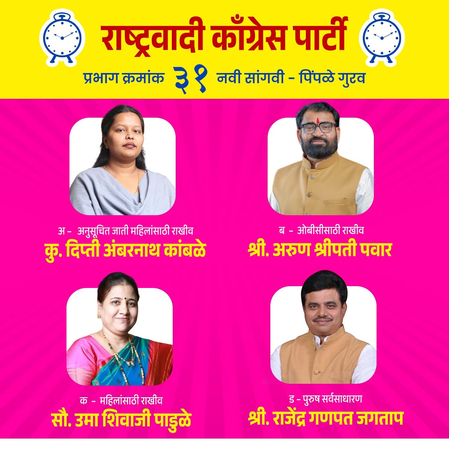 प्रभागाच्या सर्वांगीण विकासासाठी अनुभवी व जनतेसाठी अहोरात्र झटणारे उमेदवार म्हणून मतदारांचा वाढता पाठिंबा मिळत आहे. त्यामुळे राष्ट्रवादी काँग्रेस पार्टीचे प्रभाग क्र. ३१ चे चारही उमेदवार मोठ्या मताधिक्याने विजयी होतील, असा विश्वास आहे.