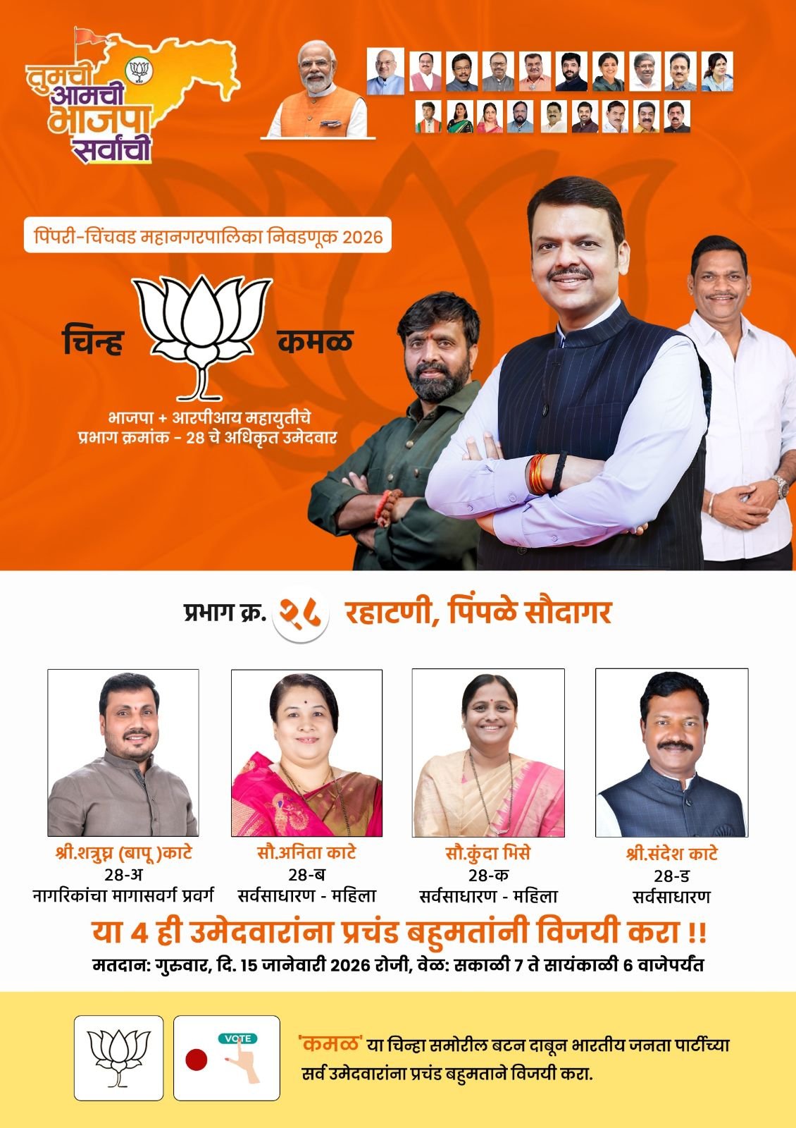 भाजपाच्या अधिकृत पॅनेलमध्ये (अ) श्री. शत्रुघ्न (बापू) काटे, (ब) सौ. अनिता काटे, (क) सौ. कुंदा भिसे आणि (ड) श्री. संदेश काटे यांचा समावेश आहे. राज्यात आणि केंद्रात भाजपा सत्ताकाळात झालेले लोकहिताचे निर्णय आणि महापालिका सत्ताकाळातील विकासकामे लोकांसमोर ठेवून उमेदवारांनी प्रचाराचा धडाका लावला आहे.