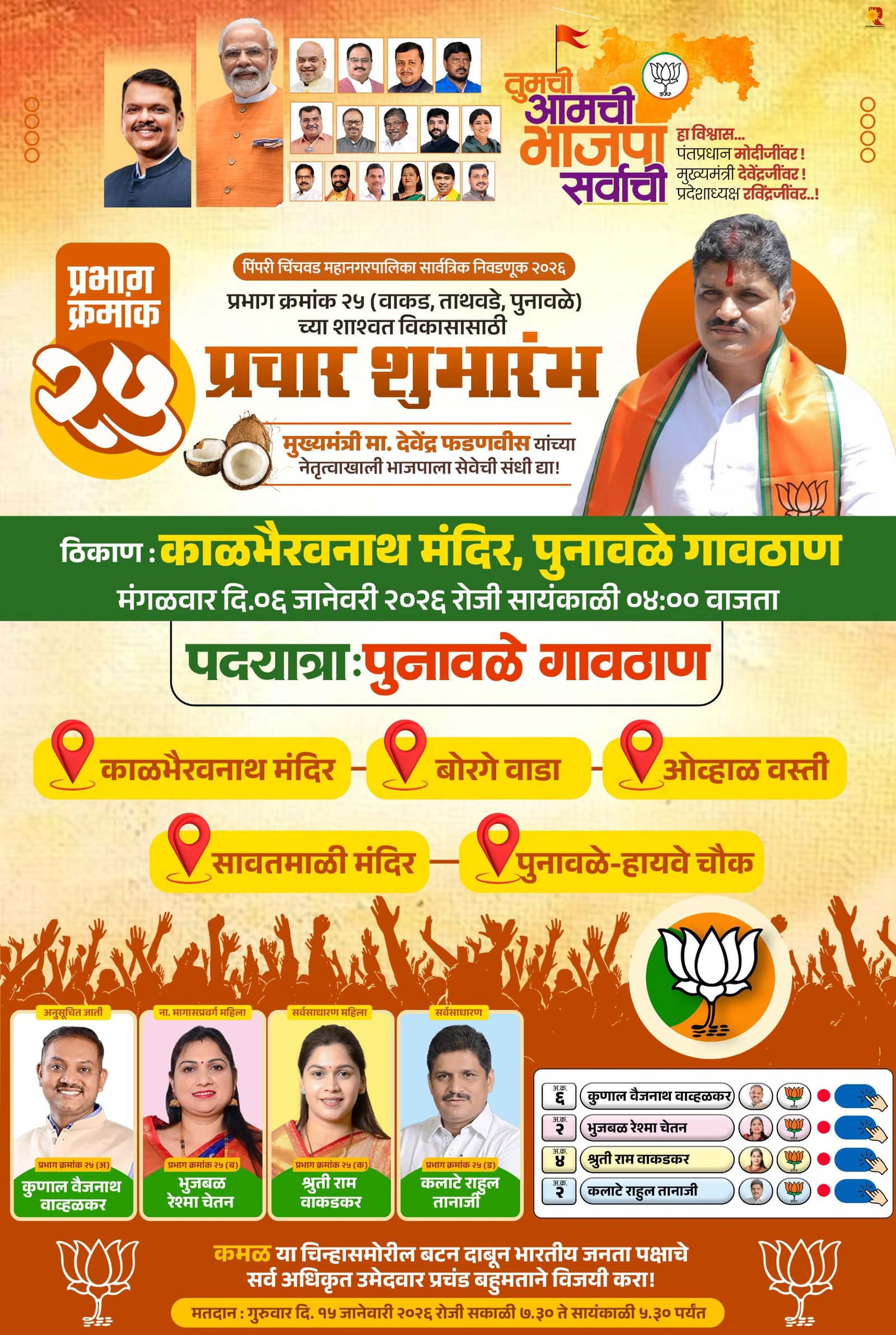 हा कार्यक्रम दिनांक ६ जानेवारी रोजी काळभैरवनाथ मंदिर, पुनावळे गावठाण येथून सायंकाळी ४.०० वाजता सुरू होईल. पदयात्रा पुनावळे गावठाण परिसरातील प्रमुख मार्गांवरून काढण्यात येणार असून, पदयात्रेचा मार्ग काळ भैरवनाथ मंदिर, बोरगे वाडा, ओव्हाळ वस्ती, सावतामाळी मंदिर मार्गे पुनावळे हायवे चौक असा मार्ग असणार आहे. यावेळी प्रभाग क्रमांक २५ मधील भाजपचे अधिकृत उमेदवार राहुल तानाजी कलाटे यांच्यासह कुणाल वाव्हळकर, श्रुती राम वाकडकर आणि रेश्मा चेतन भुजबळ, पदाधिकारी, कार्यकर्ते उपस्थित राहणार आहेत.