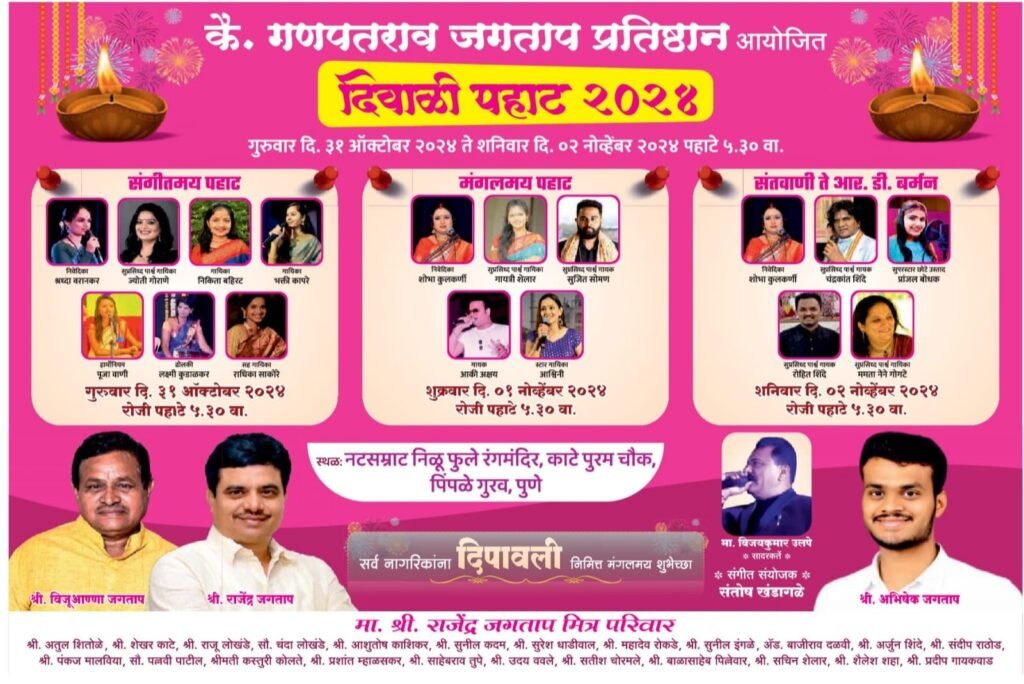 पिंपरी, (महाराष्ट्र ब्रेकिंग न्यूज ) – पिंपळे गुरव येथील कै. गणपतराव जगताप प्रतिष्ठान व राजेंद्र जगताप मित्रपरिवार यांच्या वतीने 31 ऑक्टोबर ते 02 नोव्हेंबर दरम्यान नटसम्राट निळू फुले नाट्यगृह येथे दिवाळी पहाट कार्यक्रमाचे आयोजन करण्यात आले आहे, अशी माहिती प्रतिष्ठानचे अध्यक्ष माजी नगरसेवक राजेंद्र जगताप यांनी दिली.