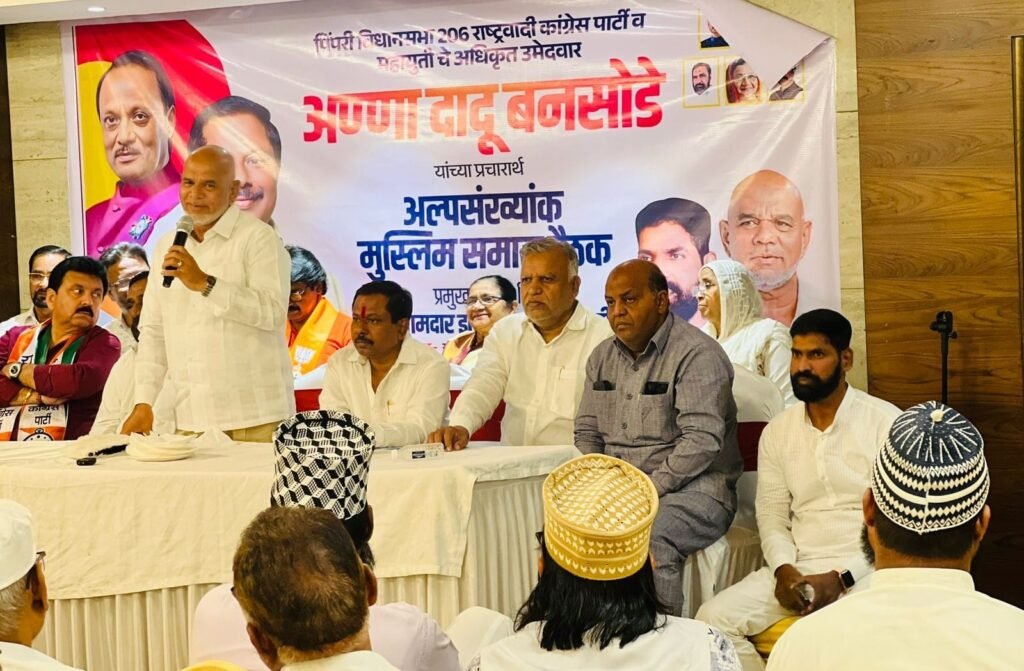 पिंपरी विधानसभा मतदार संघातील राष्ट्रवादी काँग्रेस, भारतीय जनता पार्टी, शिवसेना, आरपीआय आठवले गट व मित्र पक्षांचे अधिकृत उमेदवार आमदार अण्णा बनसोडे यांच्या प्रचारार्थ रविवारी सायंकाळी अल्पसंख्याक समाजाची बैठक आयोजित करण्यात आली होती. यावेळी राष्ट्रवादी काँग्रेसचे शहराध्यक्ष माजी महापौर योगेश बहल, भाजपाचे शहर सरचिटणीस माजी नगरसेवक राजू दुर्गे, माजी उपमहापौर मोहम्मद भाई पानसरे, स्थायी समितीचे माजी अध्यक्ष शमीम पठाण, माजी नगरसेविका अमीना पानसरे, राष्ट्रवादी काँग्रेसचे शहर कार्याध्यक्ष फजल शेख व हसीन अख्तर, माजी नगराध्यक्ष शफिक शेख तसेच शहरातील अल्पसंख्यांक व मुस्लिम समाजाचे प्रतिनिधी उपस्थित होते.