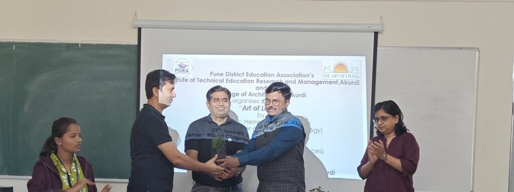 आकुर्डी, (महाराष्ट्र ब्रेकिंग न्यूज ) – पुणे जिल्हा शिक्षण मंडळाचे इन्स्टिट्यूट ऑफ टेक्निकल एज्युकेशन, रिसर्च अँड मॅनेजमेंट, आकुर्डी व कॉलेज ऑफ आर्किटेक्चर,आकुर्डी यांच्या संयुक्त विद्यमाने एमबीए महाविद्यालयात दिनांक २९/०१/२०२५ रोजी “आर्ट ऑफ लिविंग” या विषयावर श्री.सौरभ रत्नाकर यांच्या व्याख्यानाचे आयोजन करण्यात आले होते. महाविद्यालयाचे संचालक डॉ. संतोष खलाटे हे या कार्यक्रमाच्या अध्यक्षस्थानी होते. यावेळी श्री.रत्नाकर यांनी प्राणायाम-योगसाधना याची दैनंदिन जीवनातील गरज सांगून, याचे विद्यार्थी जीवनात होणारे सकारात्मक परिणाम हे विद्यार्थ्याना सांगितले.