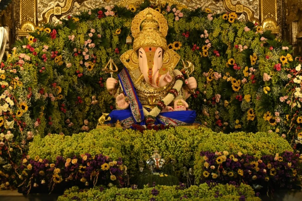 पुणे, (महाराष्ट्र ब्रेकिंग न्यूज) – काळ्या आणि हिरव्या द्राक्षांनी श्रीमंत दगडूशेठ हलवाई गणपती मंदिरातील गाभारा व सभामंडप सजवून द्राक्ष महोत्सव करण्यात आला. श्रीमंत दगडूशेठ हलवाई सार्वजनिक गणपती ट्रस्टतर्फे आयोजित महोत्सवात नाशिक येथील सह्याद्री फार्म कंपनीच्या शेतक-यांनी पिकवलेल्या निर्यातक्षम व रसायनविरहित २ हजार किलो द्राक्षांची आरास करण्यात आली.