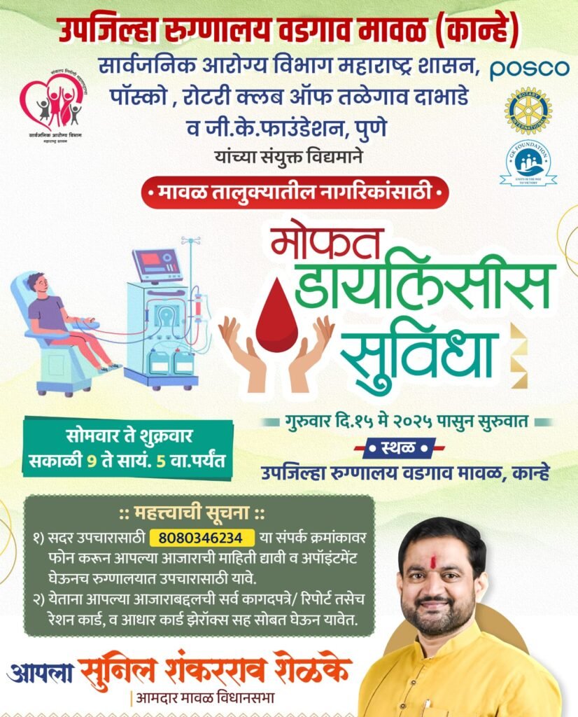 वडगाव मावळ ( महाराष्ट्र ब्रेकिंग न्यूज) -+ मावळ तालुक्यातील मूत्रपिंड विकारांनी ग्रस्त रुग्णांसाठी एक महत्त्वाची आणि दिलासादायक सुविधा सुरू करण्यात आली आहे. उपजिल्हा रुग्णालय वडगाव मावळ (कान्हे) येथे उद्या, गुरुवार, दि. १५ मे २०२५ पासून मोफत डायलिसीस सुविधा उपलब्ध करून देण्यात येत आहे, अशी घोषणा मावळचे आमदार सुनील शेळके यांनी केली.