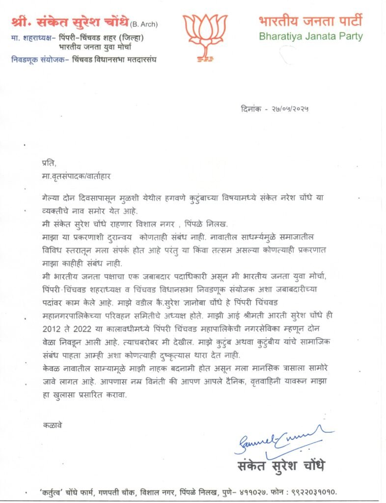 पिंपरी, (महाराष्ट्र ब्रेकिंग न्यूज) – गेल्या दोन दिवसापासून मुळशी येथील हगवणे कुटुंबाच्या विषयामध्ये संकेत नरेश चोंधे या