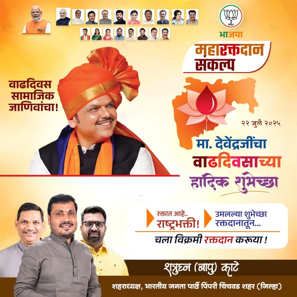 “रक्तदान हीच खरी समाजसेवा असून,मुख्यमंत्री देवेंद्रजी फडणवीस यांच्या समाजाभिमुख कार्याला मानवंदना म्हणून आपण सर्वांनी या उपक्रमात सहभागी व्हावे. प्रत्येक थेंब महत्त्वाचा आहे, आणि प्रत्येक रक्तदाता ही प्रेरणा आहे!” असे आवाहन श्री.शत्रुघ्न काटे यांनी पिंपरी चिंचवड शहर वासियांना केले आहे.
