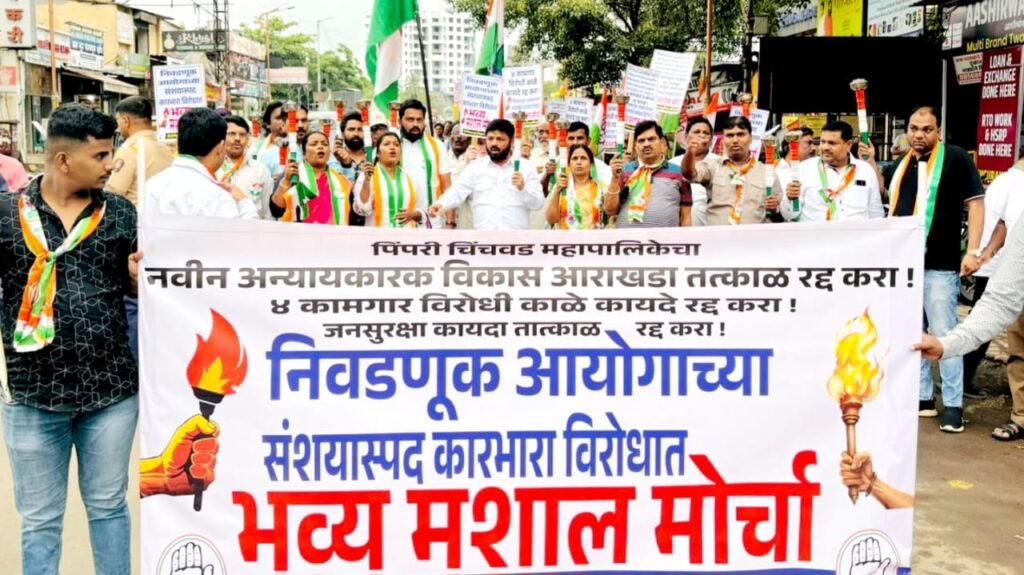 पिंपरी, (महाराष्ट्र ब्रेकिंग न्यूज) – पिंपरी चिंचवड शहर काँग्रेस कमिटीच्या वतीने महाराष्ट्र विधानसभा निवडणूक २०२४ मध्ये झालेल्या गंभीर अनियमितता, मतदारयादीतील घोळ आणि मतदान टक्केवारीतील तफावत या मुद्यांवर न्यायालयीन चौकशी करण्याची मागणी करण्यात आली. या मागणीच्या समर्थनार्थ (दि. २६ जुलै २०२५) “मशाल मोर्चा” काढण्यात आला.