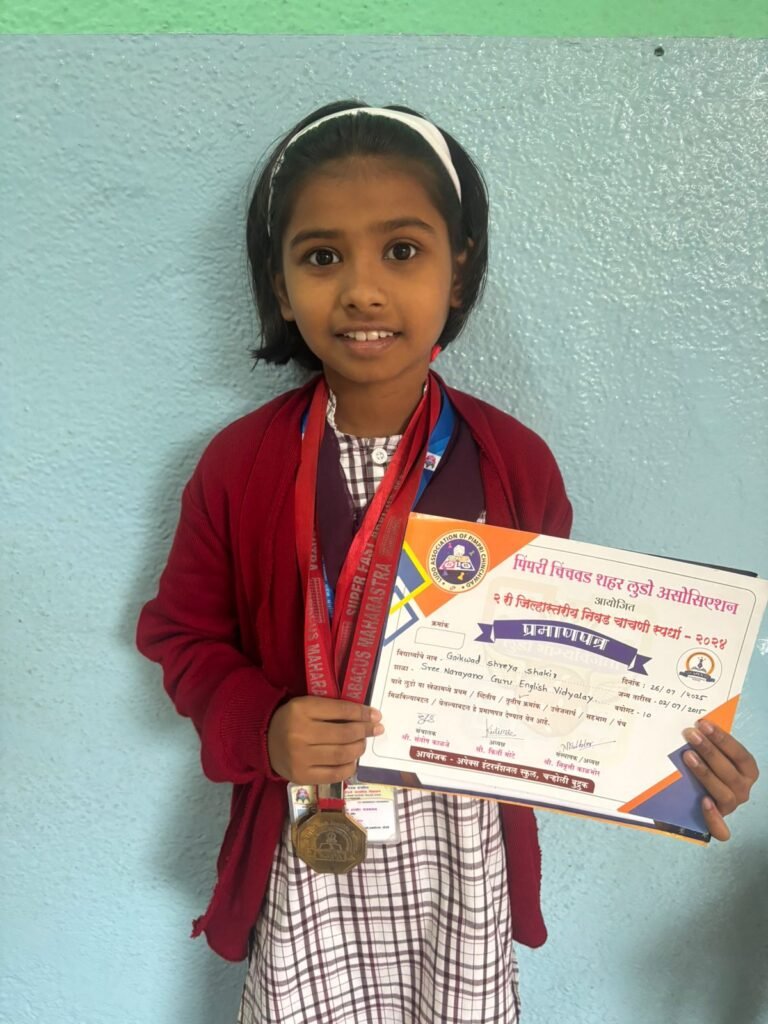कु श्रेया शाकीर गायकवाड इ 5 वी हिने पुणे येथे दि 26/7/2025 रोजी झालेल्या जिल्हा स्तरीय निवड स्पर्धेत भाग घेऊन तृतीय क्रमांक प्राप्त केला त्याबद्दल तिचे संस्थेच्या वतीने संस्थेचे अध्यक्ष जगदीश दादा जाधव, सचिव संजय भाऊ जाधव, संचालक विजय जाधव सर, उपाध्यक्ष श्री अमित बच्छाव यांनी अभिनंदन केले.